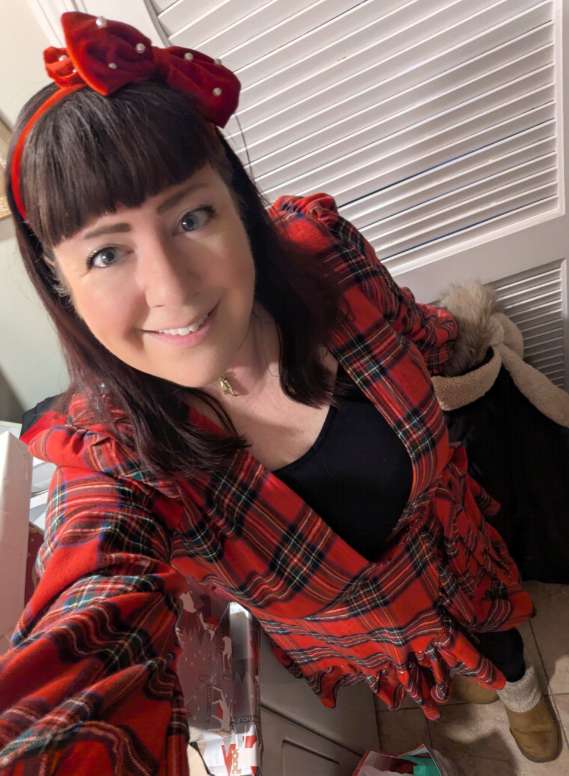 On: Red Plaid Blouson Sleeve Ruffle Cuff Wrap Mini Dress