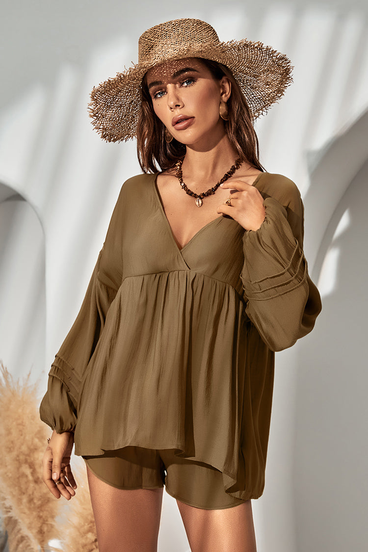 HomeV-neck Puff Sleeve Tie Cover Up Top