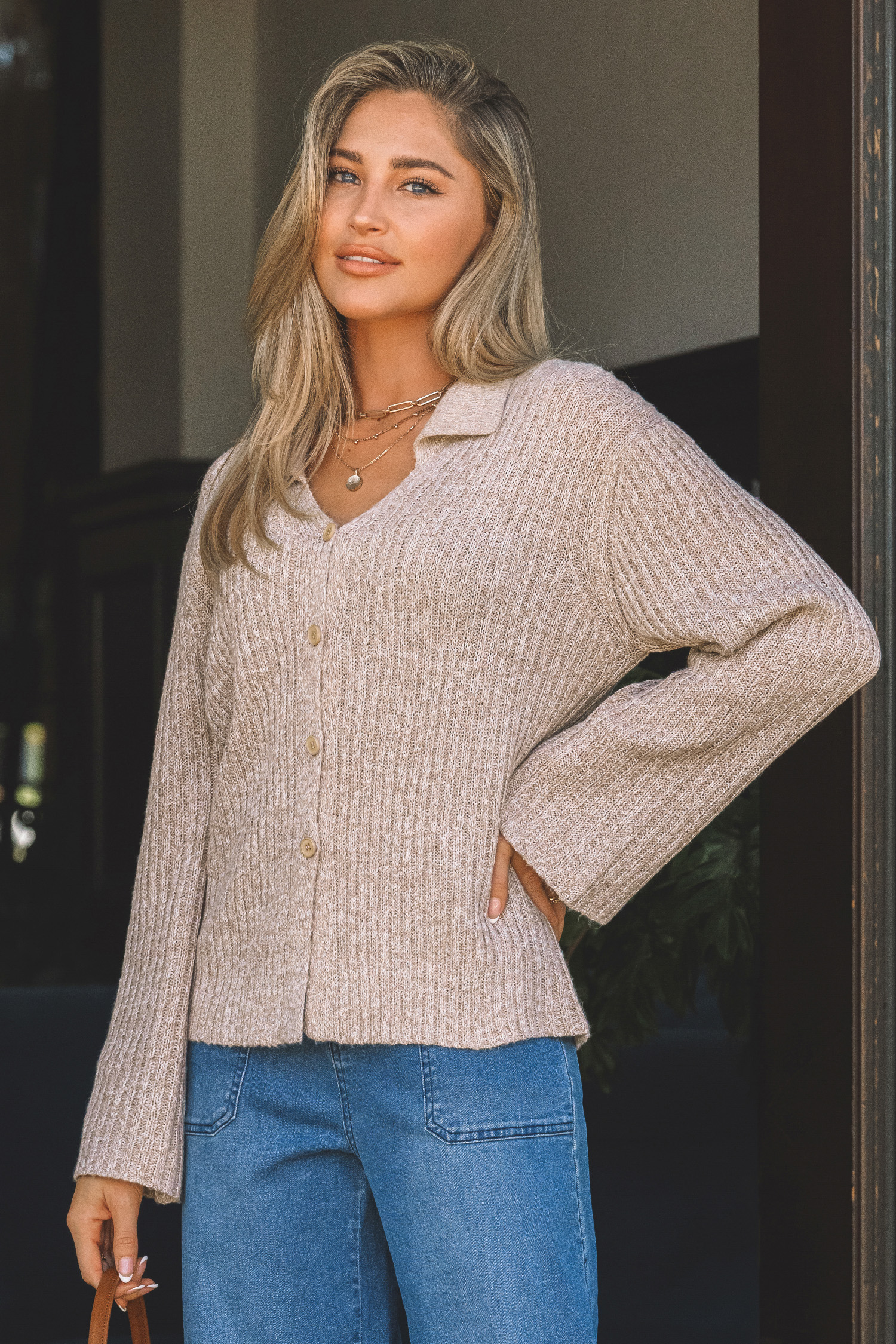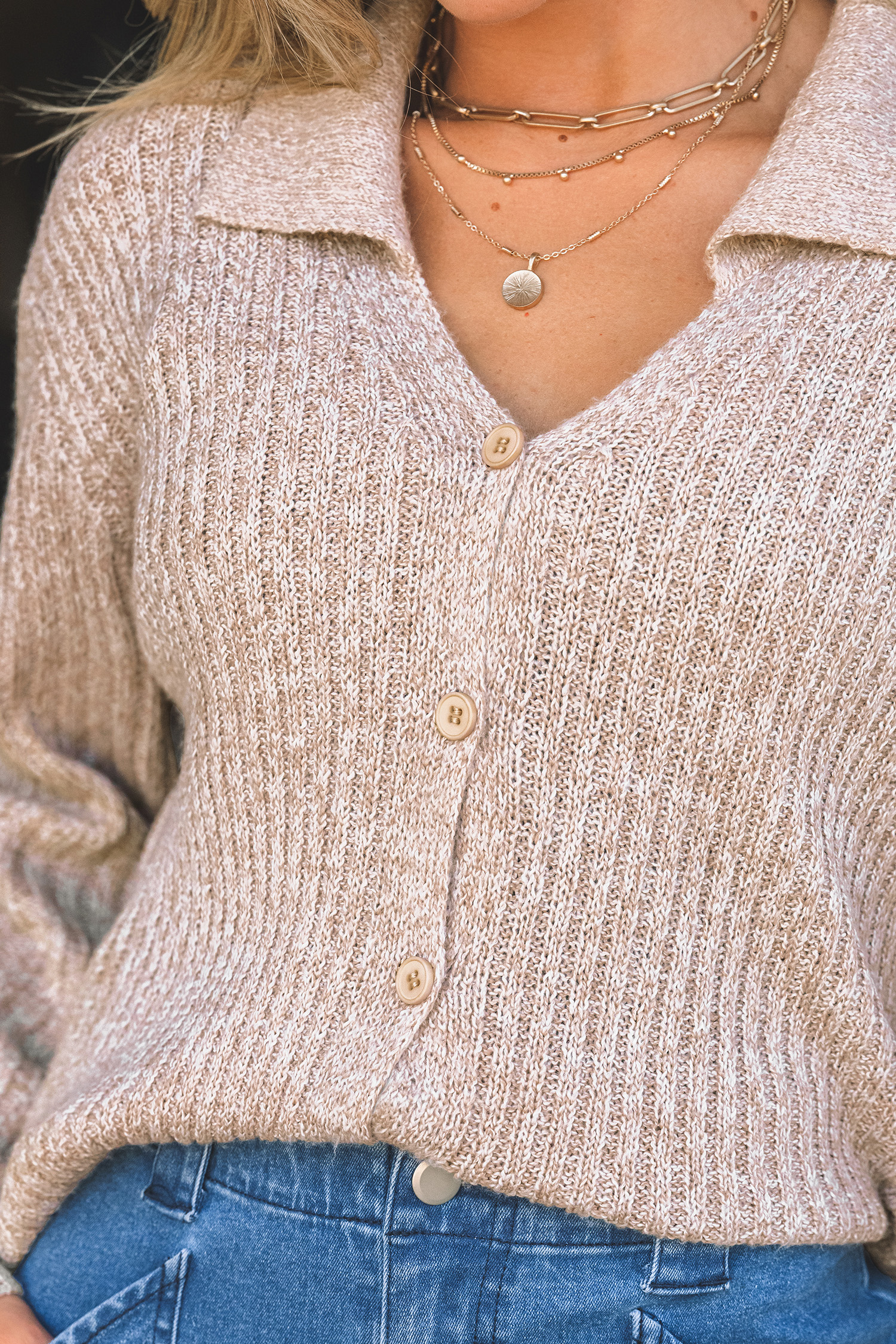 Apricot Ribbed Knit Collared Button-Up Sweater Top