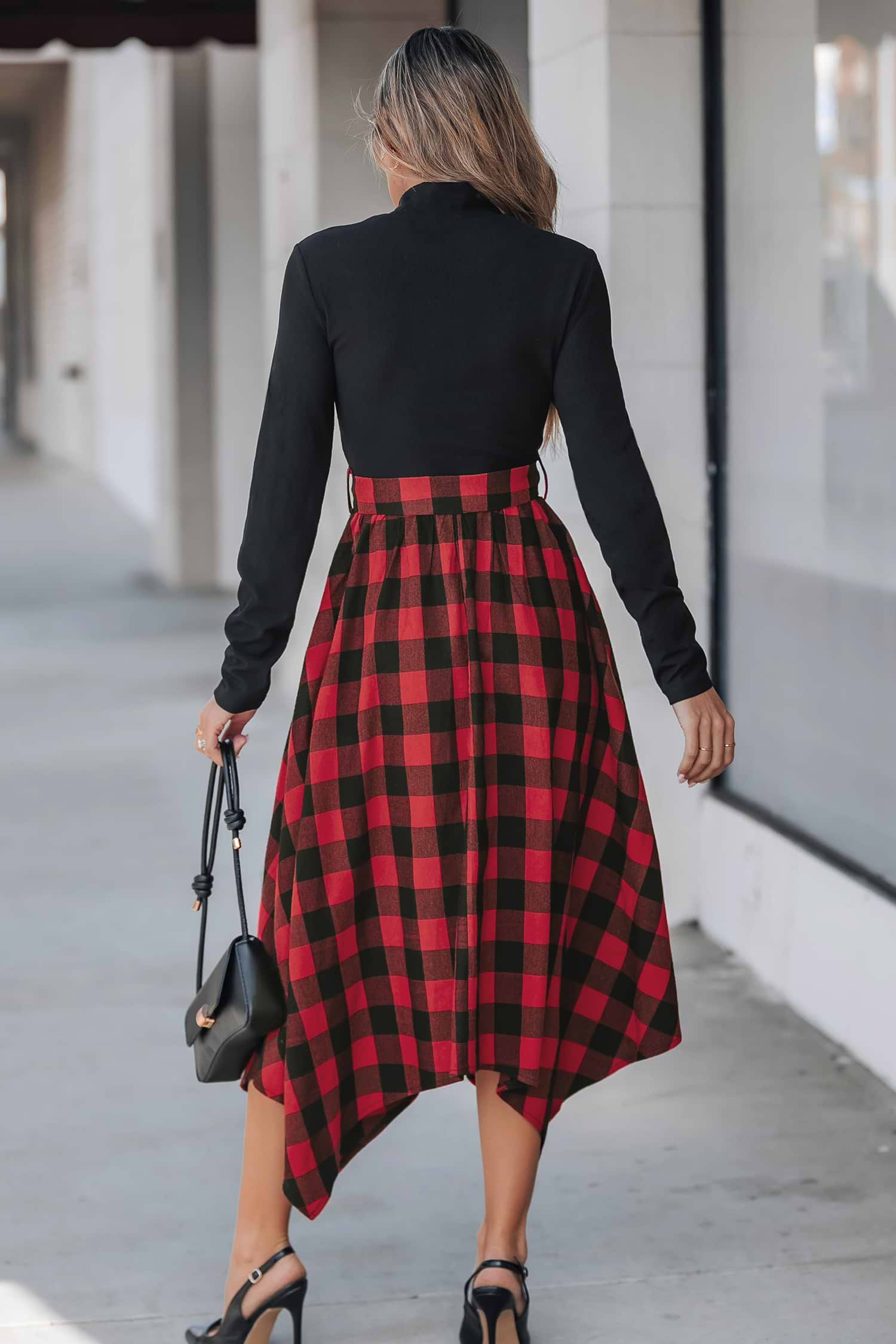 Black Mockneck Top Plaid Handkerchief Hem Skirt Midi Dress