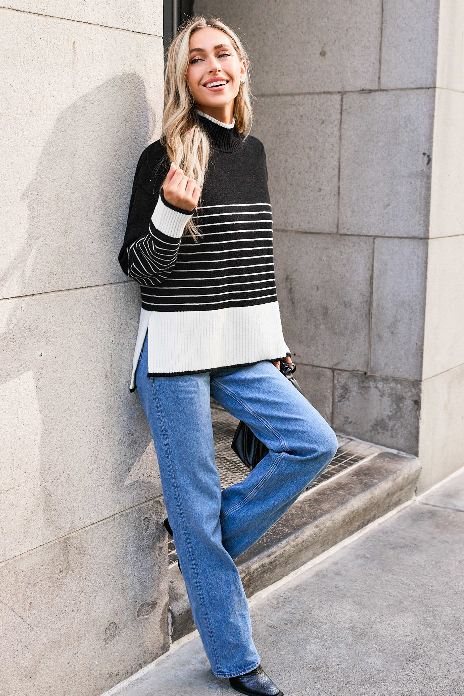 Black Striped Split High Neck Knit Top