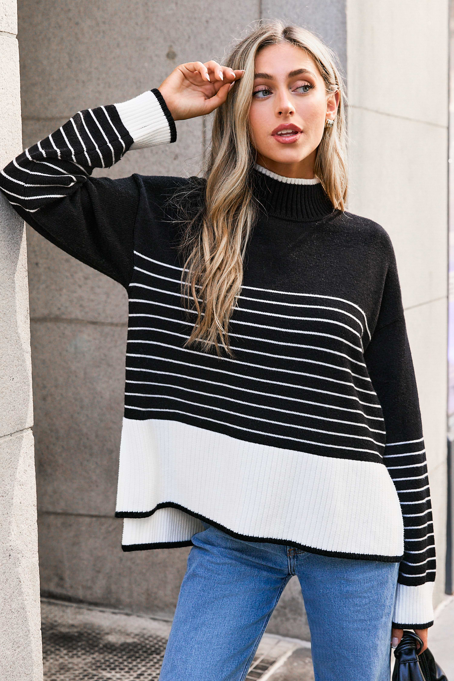 HomeBlack Striped Split High Neck Knit Top