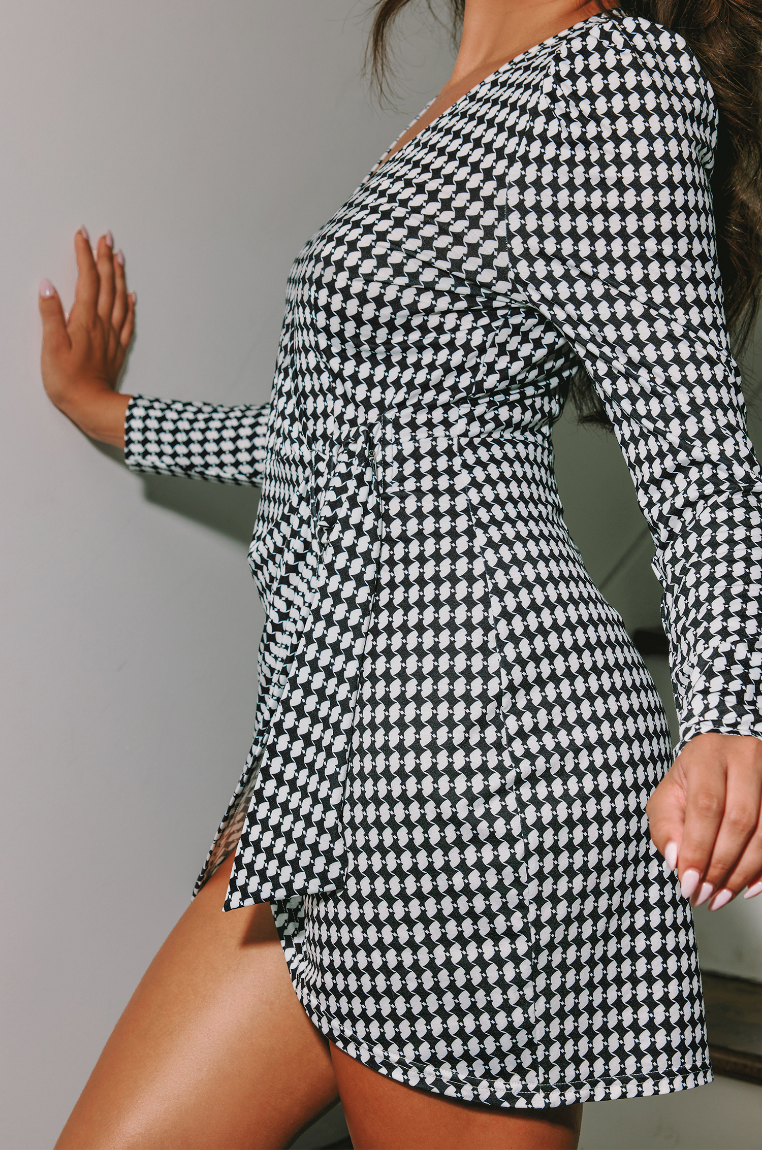 Black & White Geo Puff Shoulder Long Sleeve Wrap Mini Dress