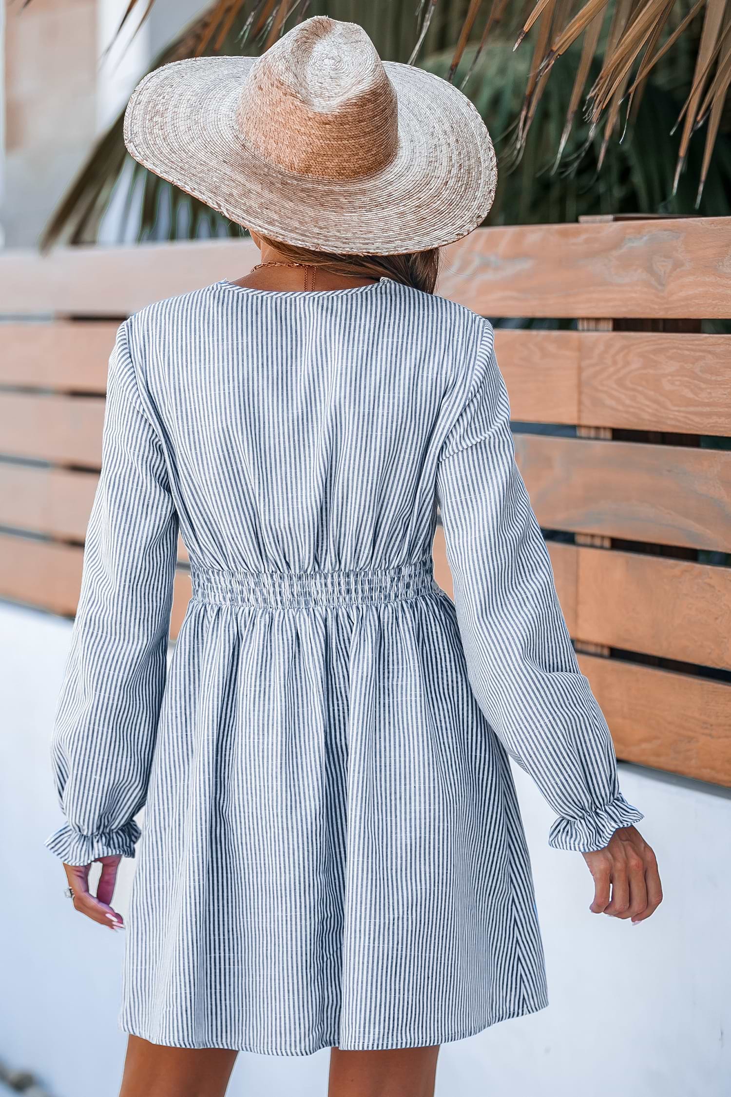 Blue Pinstripe & Lace Puff Sleeve Mini Dress