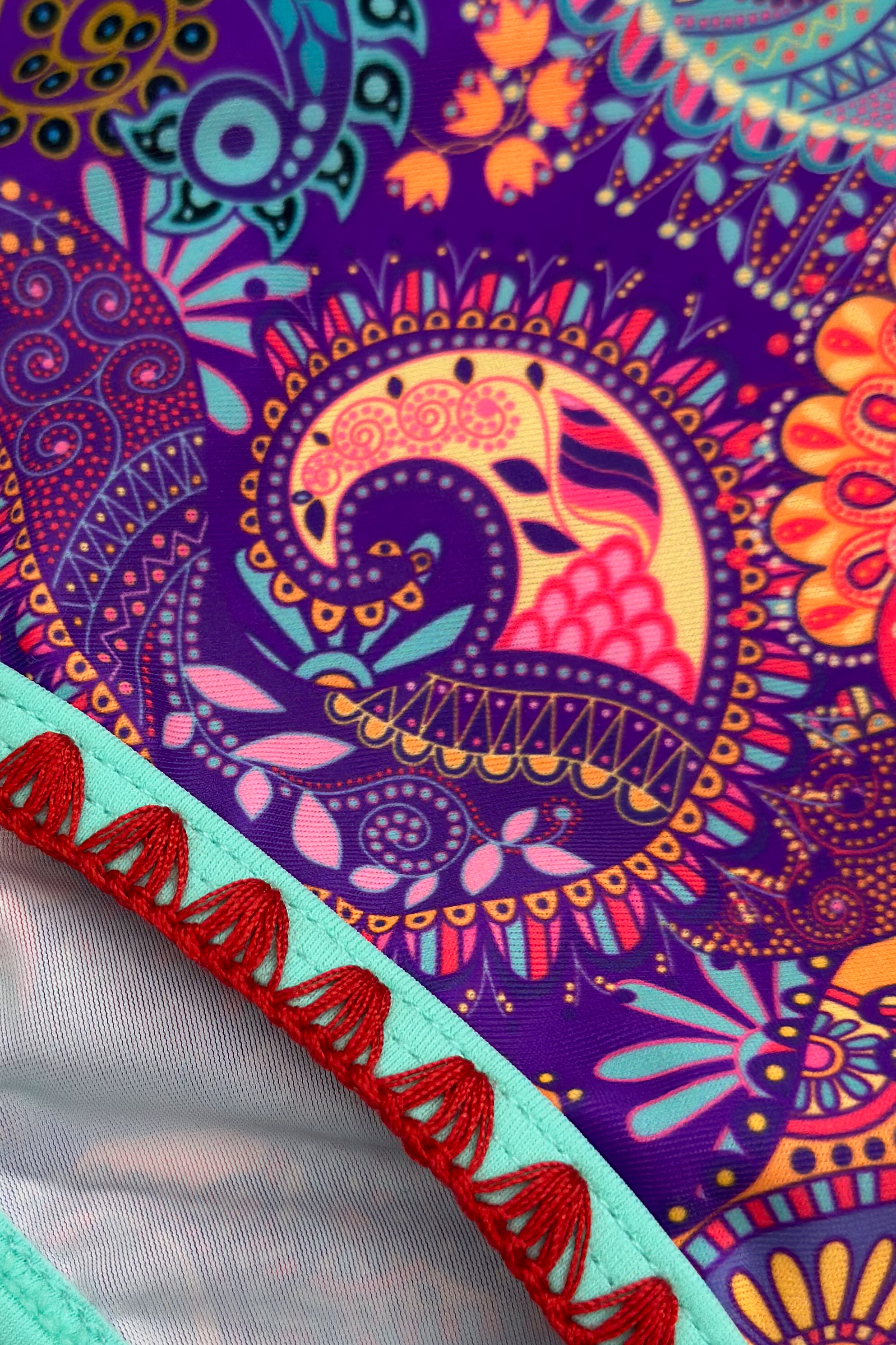 Boho Paisley V-Neck Triangle Top & Shell-Stitched Bikini Set