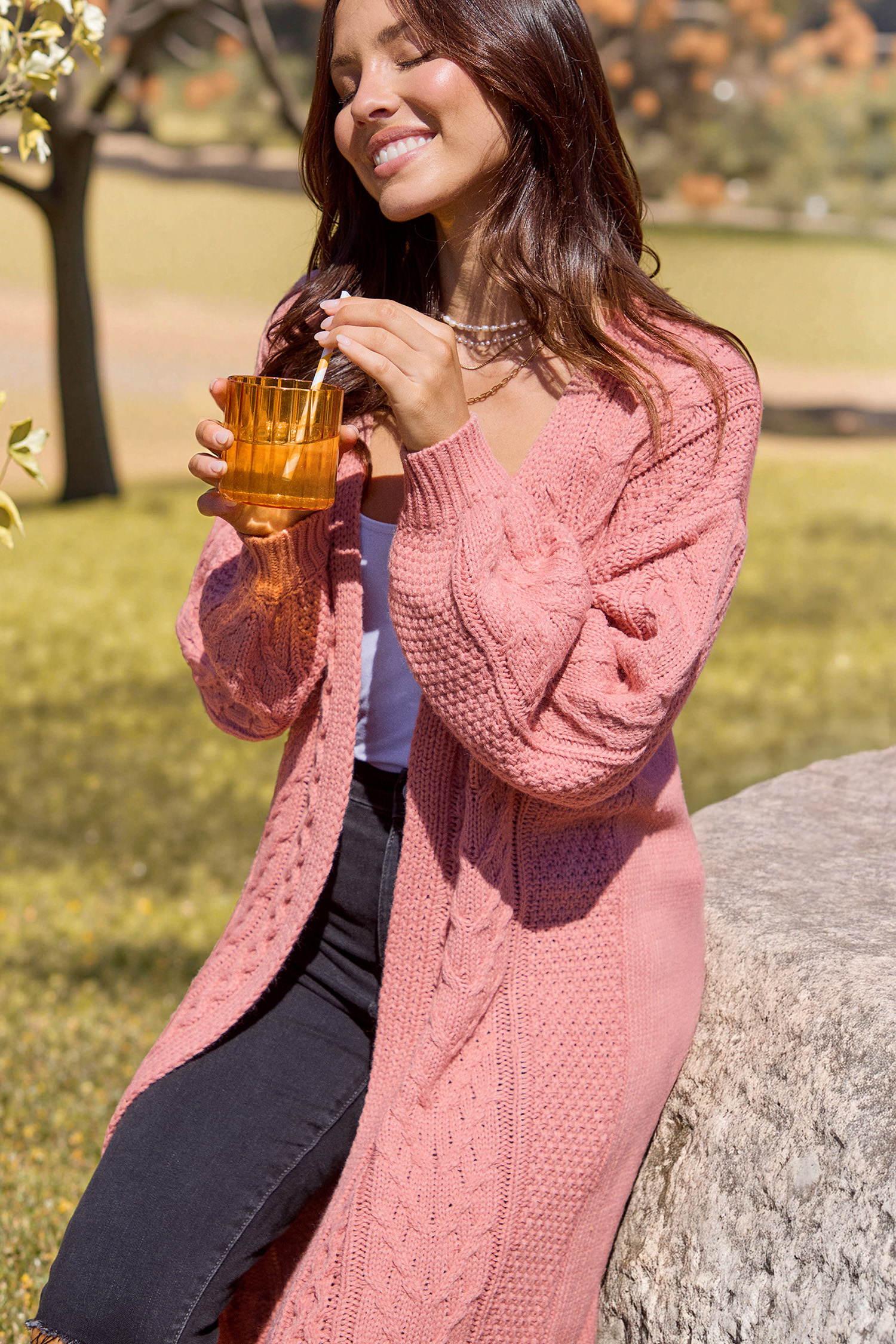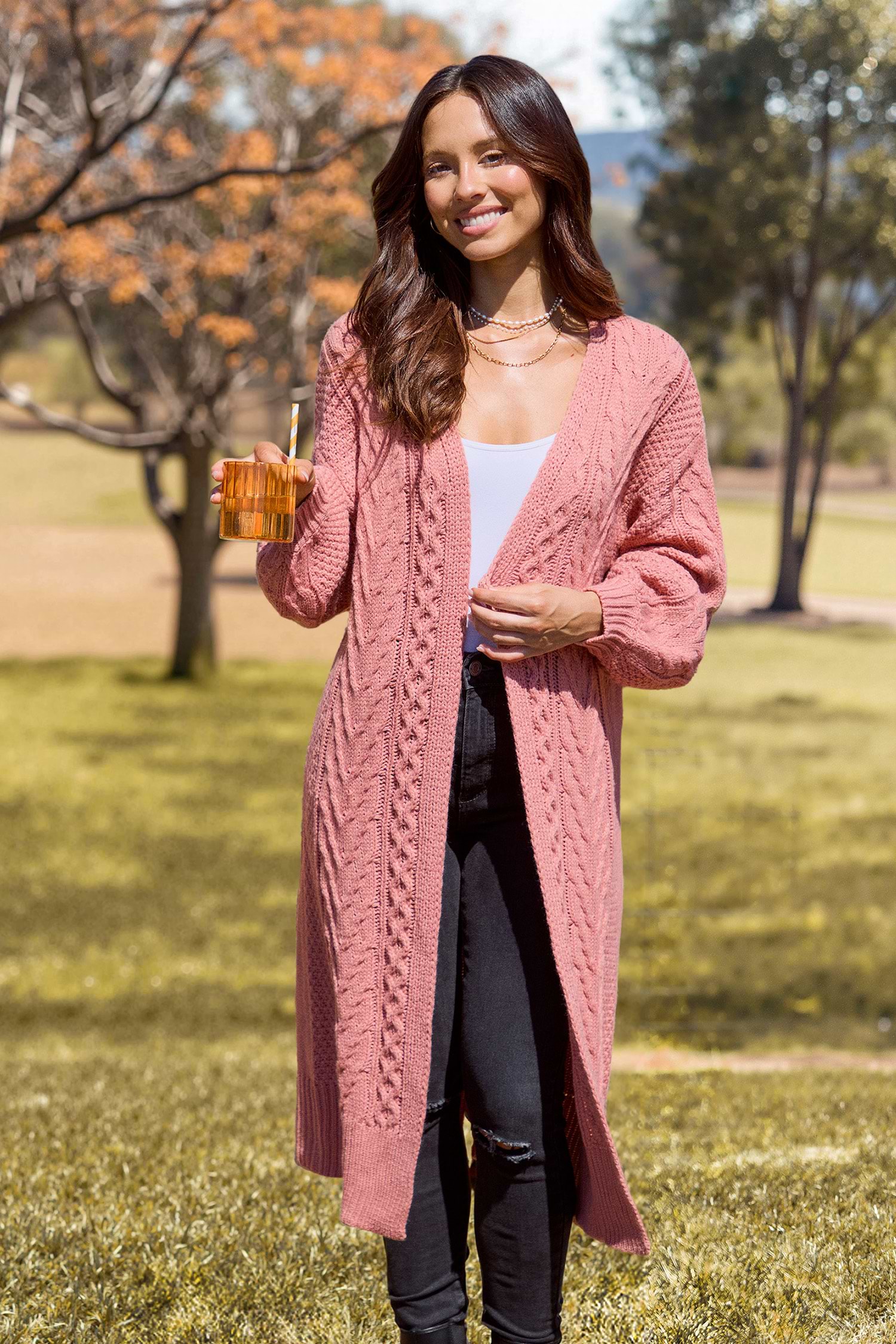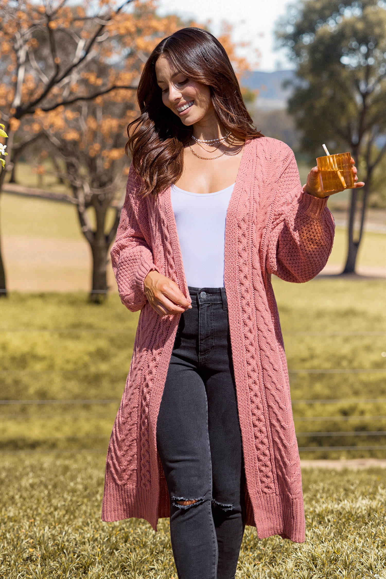 Halloween Coral Open Front Long Sleeve Cable Knit Longline Cardigan