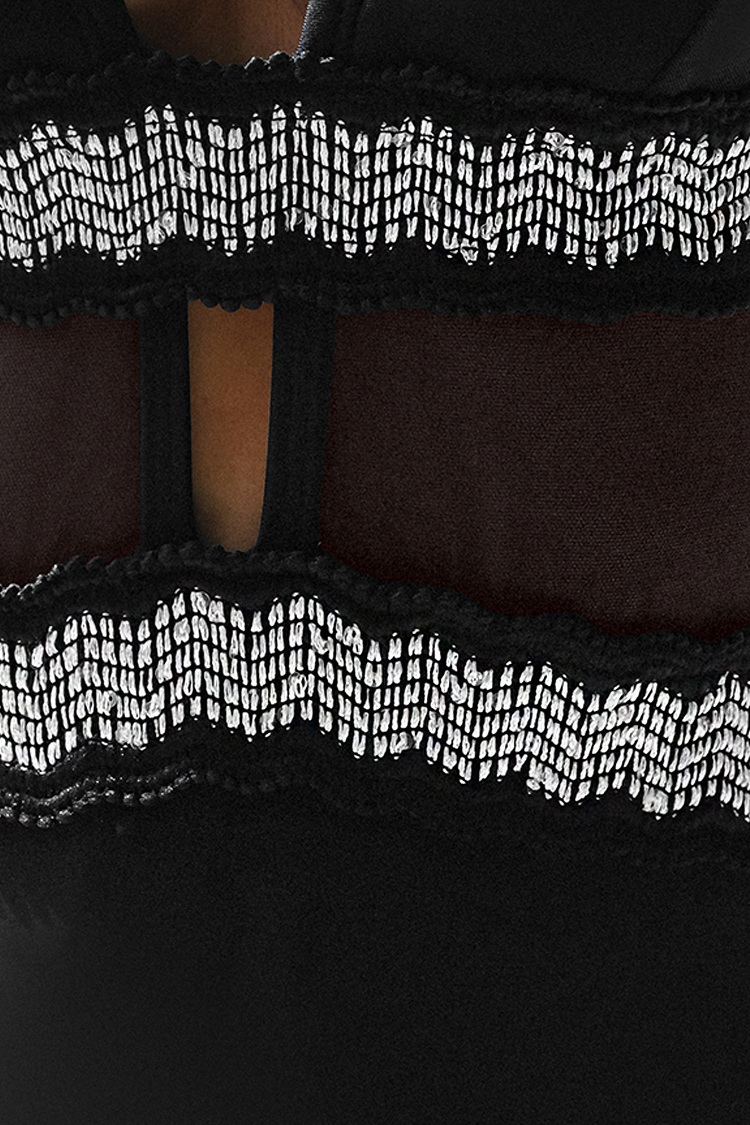 Embroidered Detailing Black Mesh Plunging One Piece Swimsuit