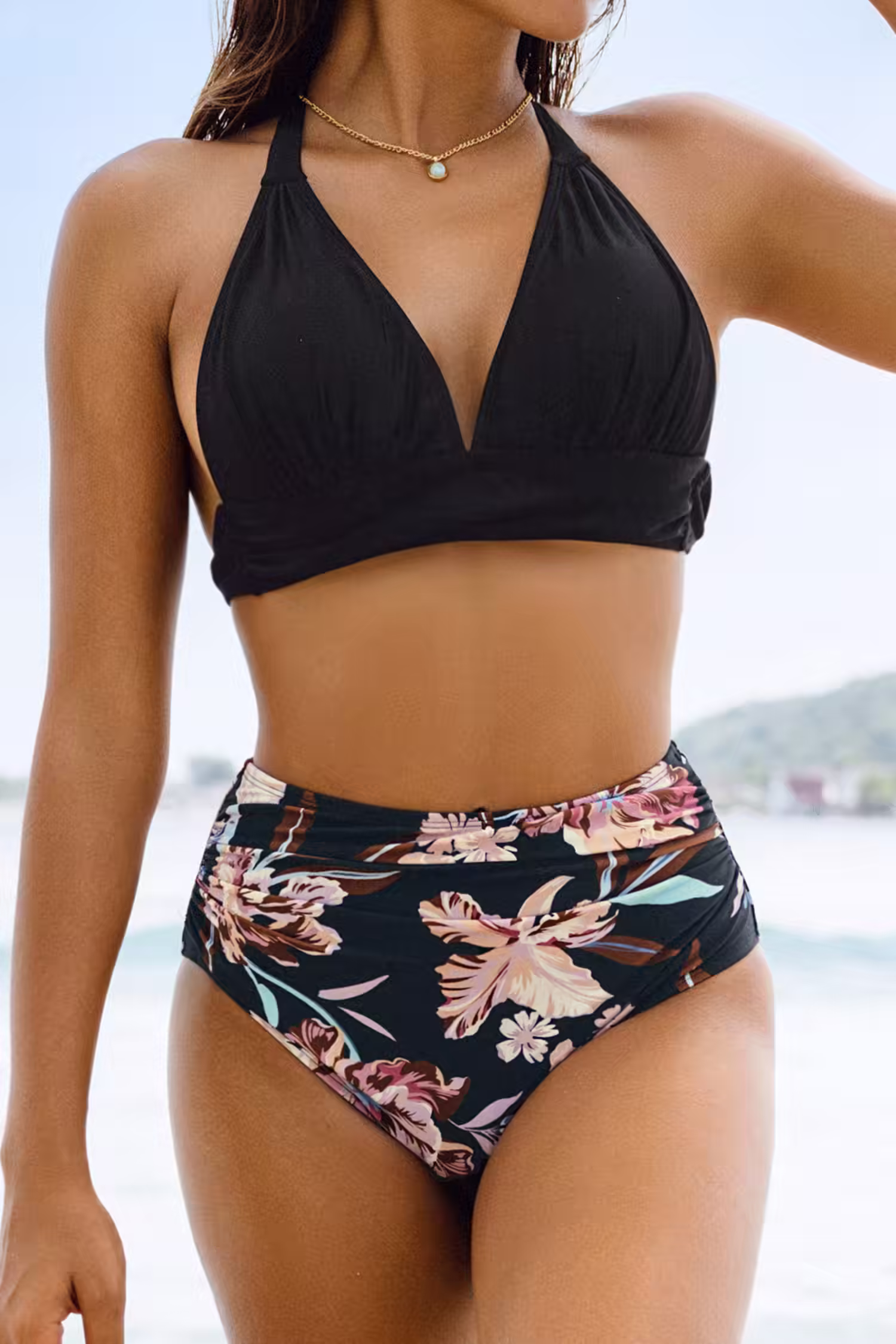 Black Shirred Halter Triangle Top & Hot Tropics High Waist Bikini Swimsuit