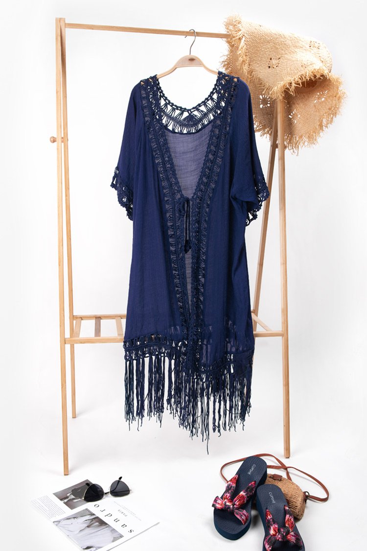 Flamenco Navy Front Open Tassel Crochet Kimono