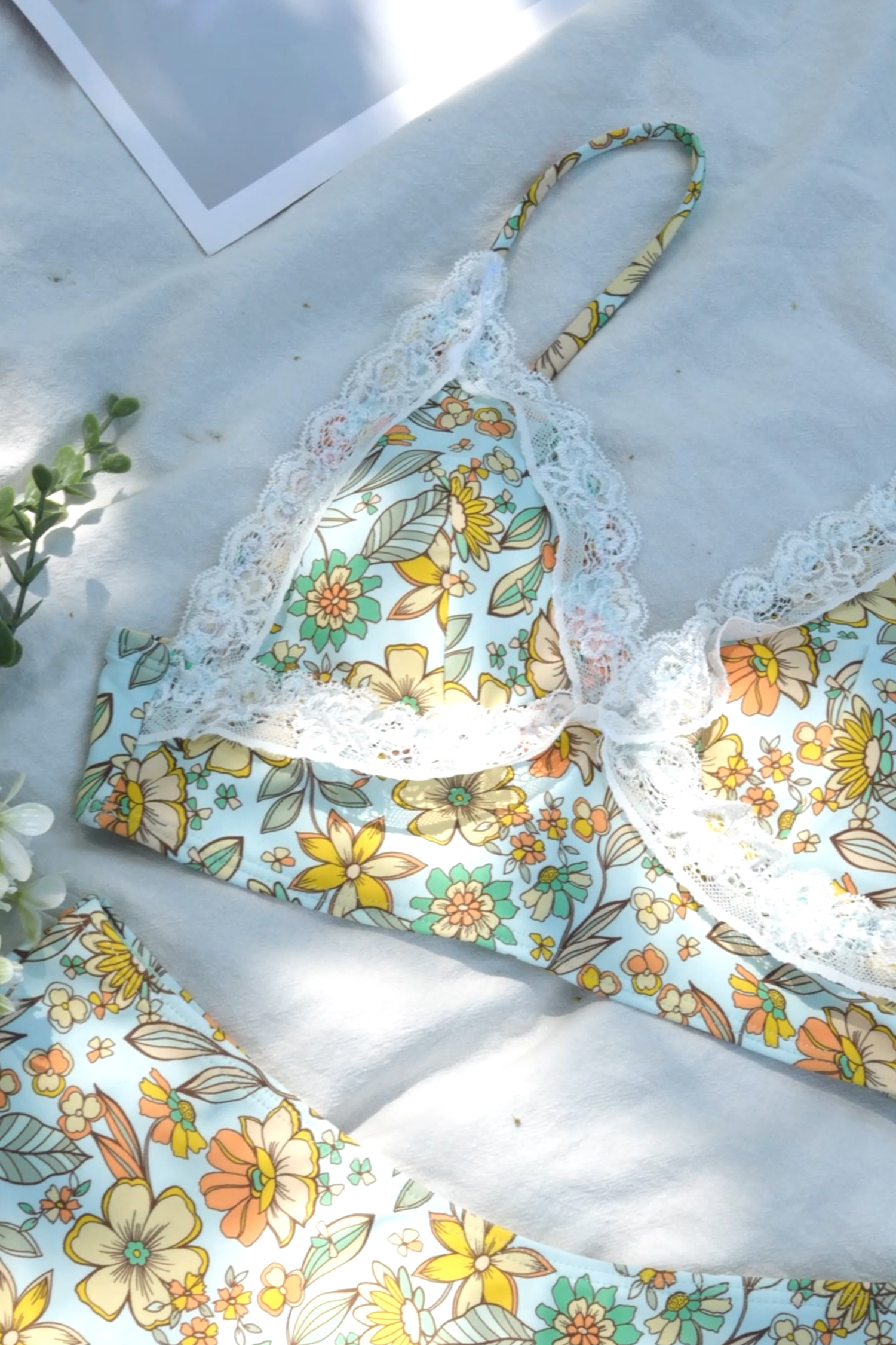 Floral Print Lace Bralette & Retro-Full Coverage Bikini Set