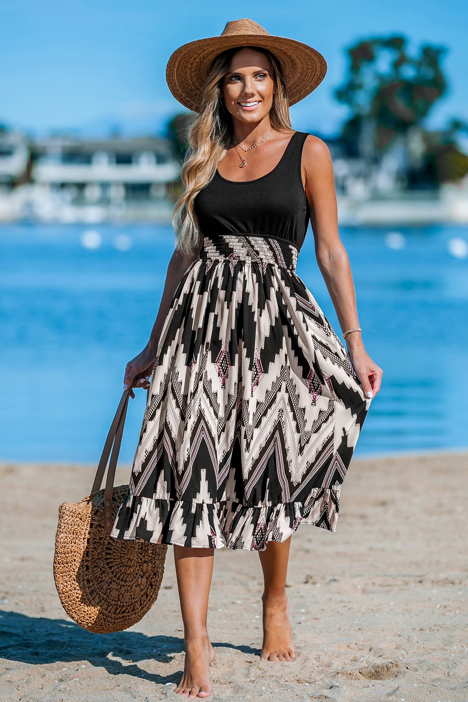 Geo Smocked Waist Ruffle Hem Midi Dress