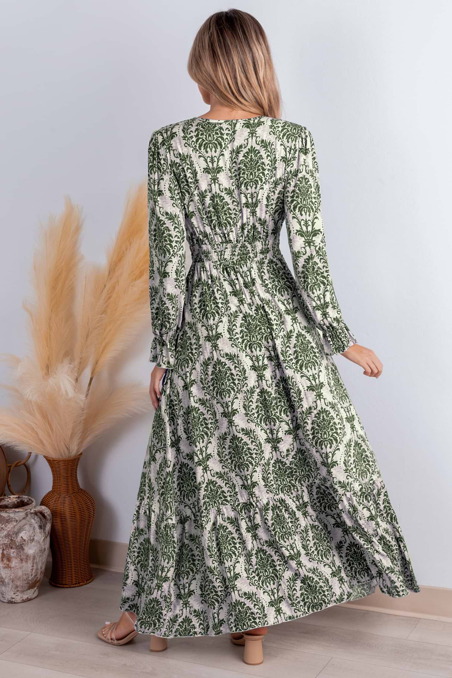 Green Damask Long Sleeve V-Neck Maxi Dress