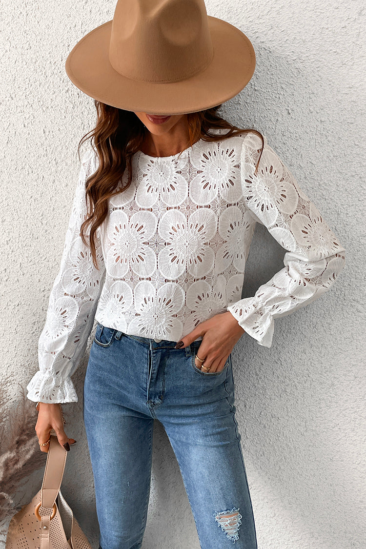 Embrace your inner feminine energy in this romantic top featuring allover floral eyelet embroidery, a round neckline, and long trumpet sleeves with flounce cuffs.