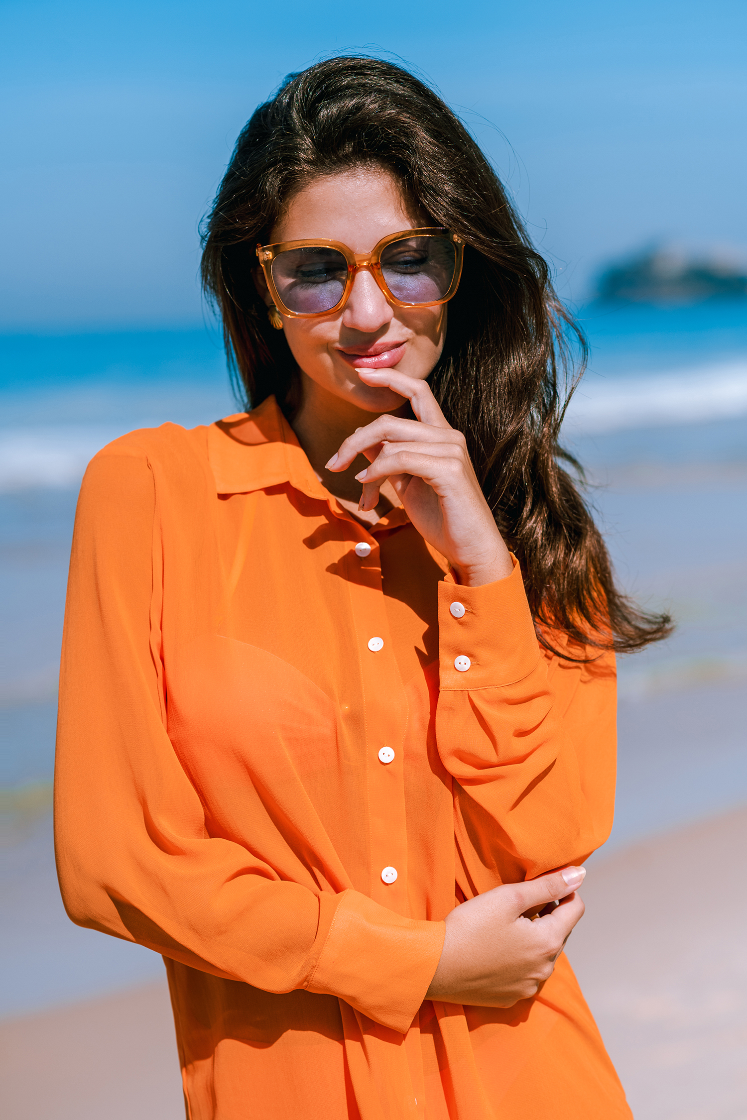 MSW Sunset Orange Sheer Collared Button-Up Cover-Up Top