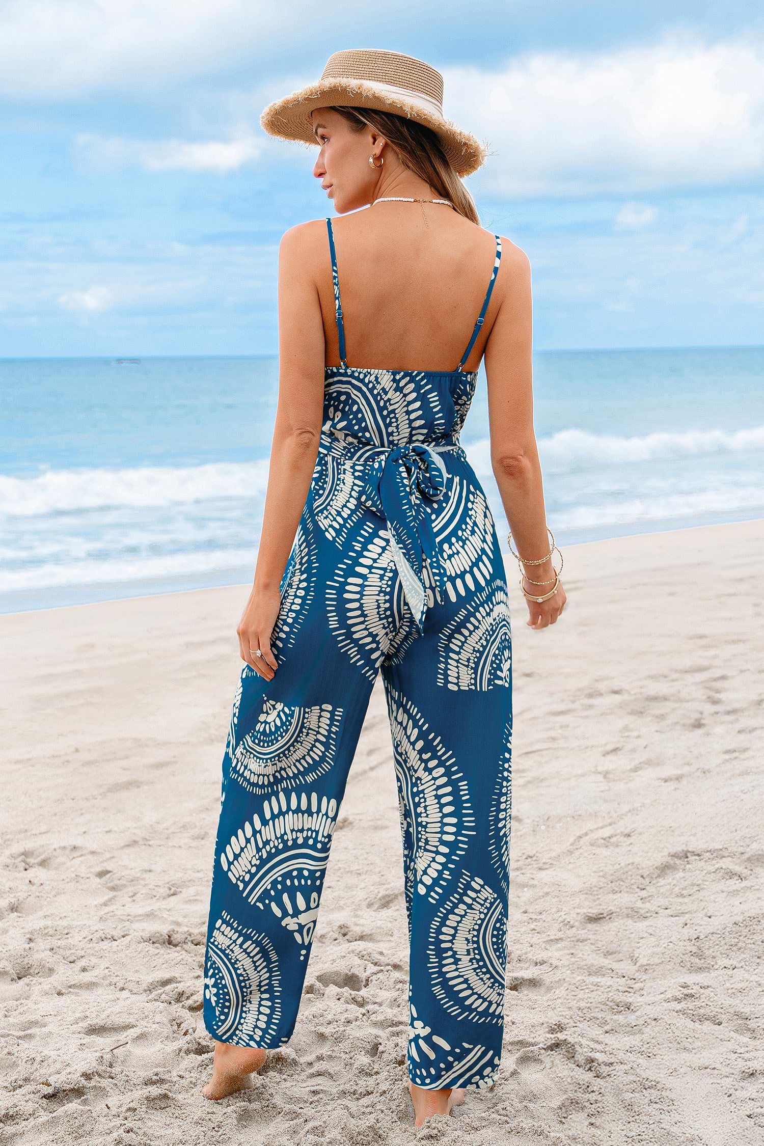Embrace your free-spirited side with the Nomad Spirit Blue Jumpsuit. The flowing wide-leg design and boho-chic print make it perfect for adventures near and far, while the belted waist creates a flattering, effortless silhouette. Whether you're wandering through markets or dancing under the stars, this jumpsuit is your ultimate style companion!