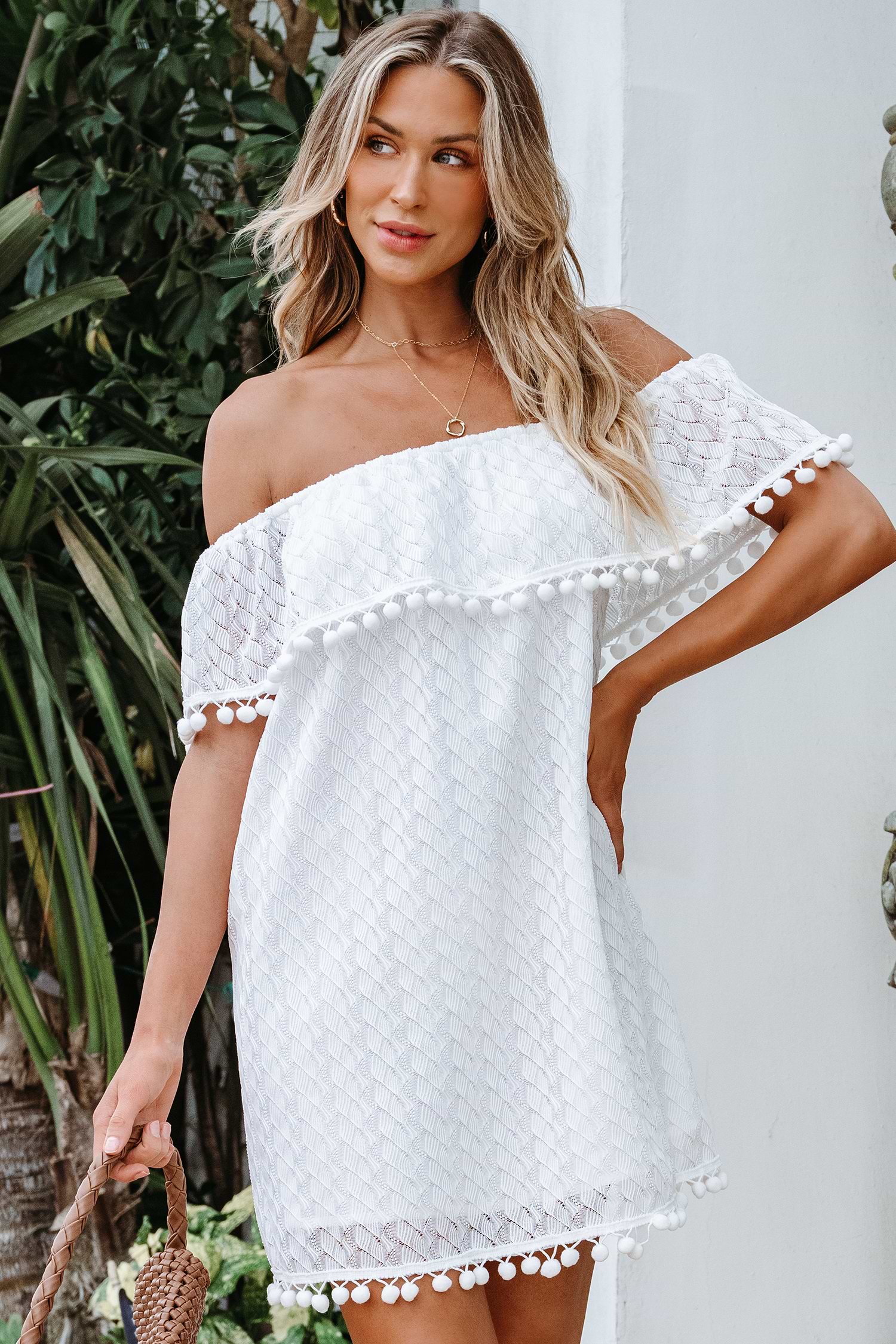 HomeOff-Shoulder Pom-Pom Mini Dress
