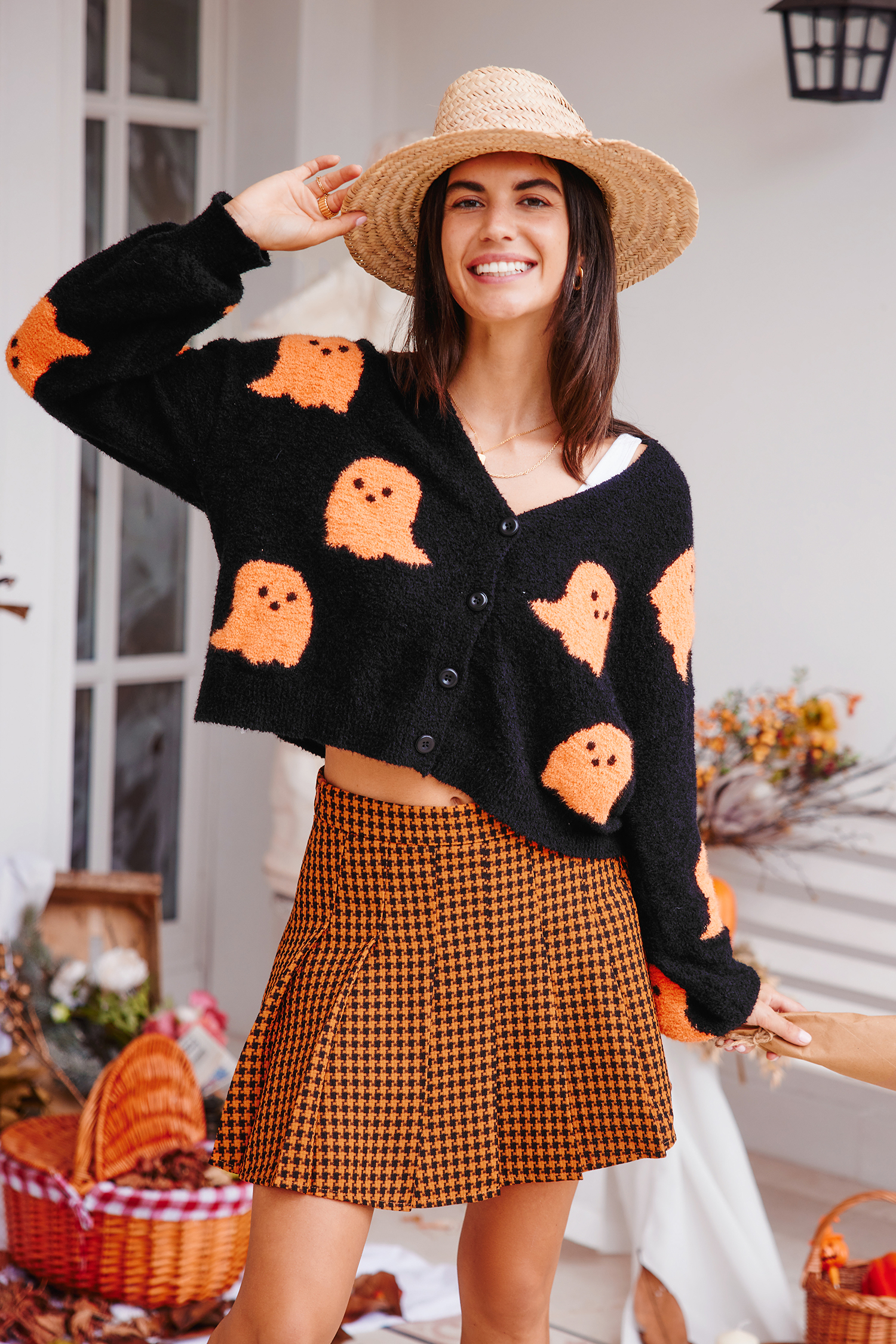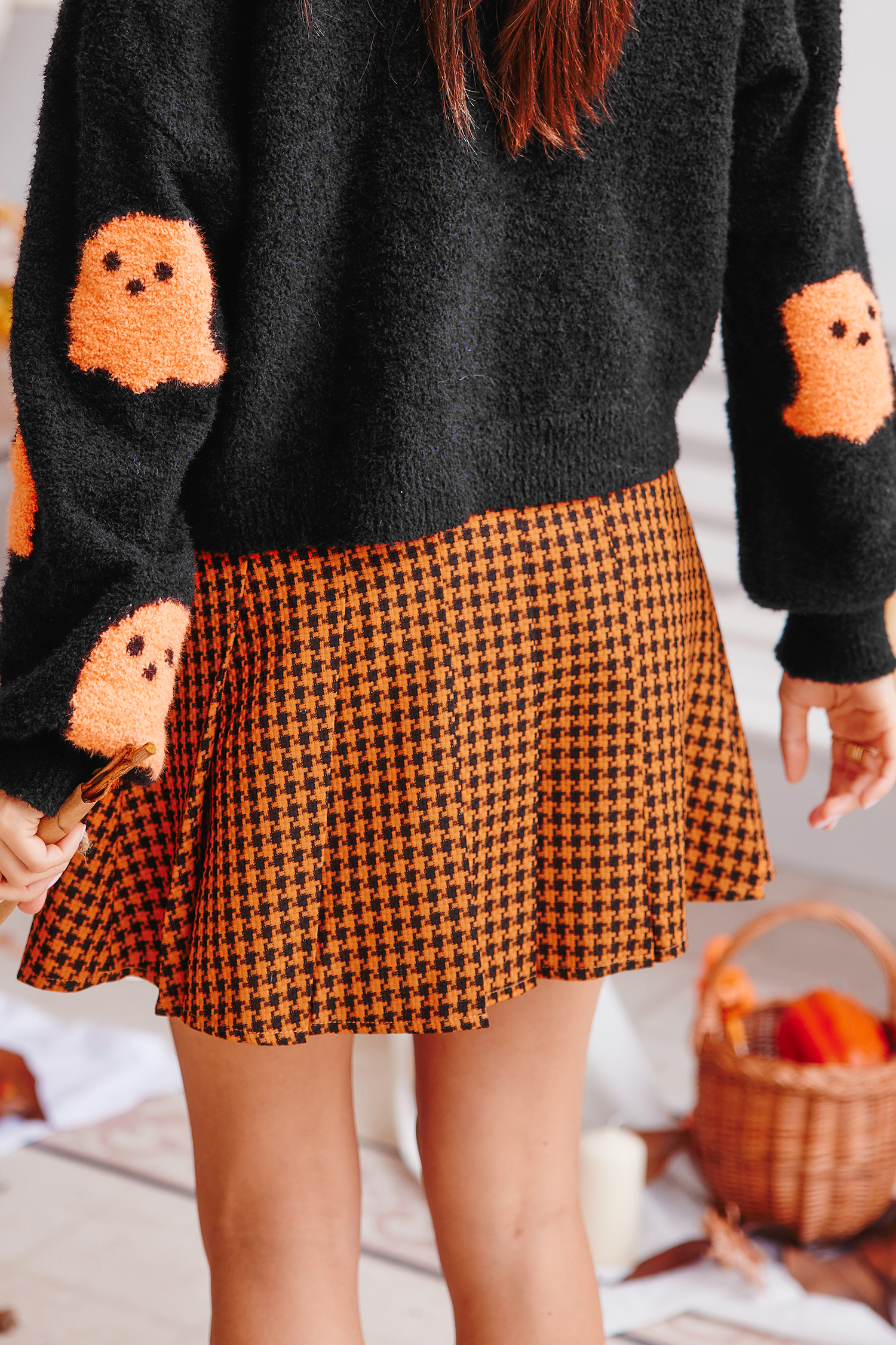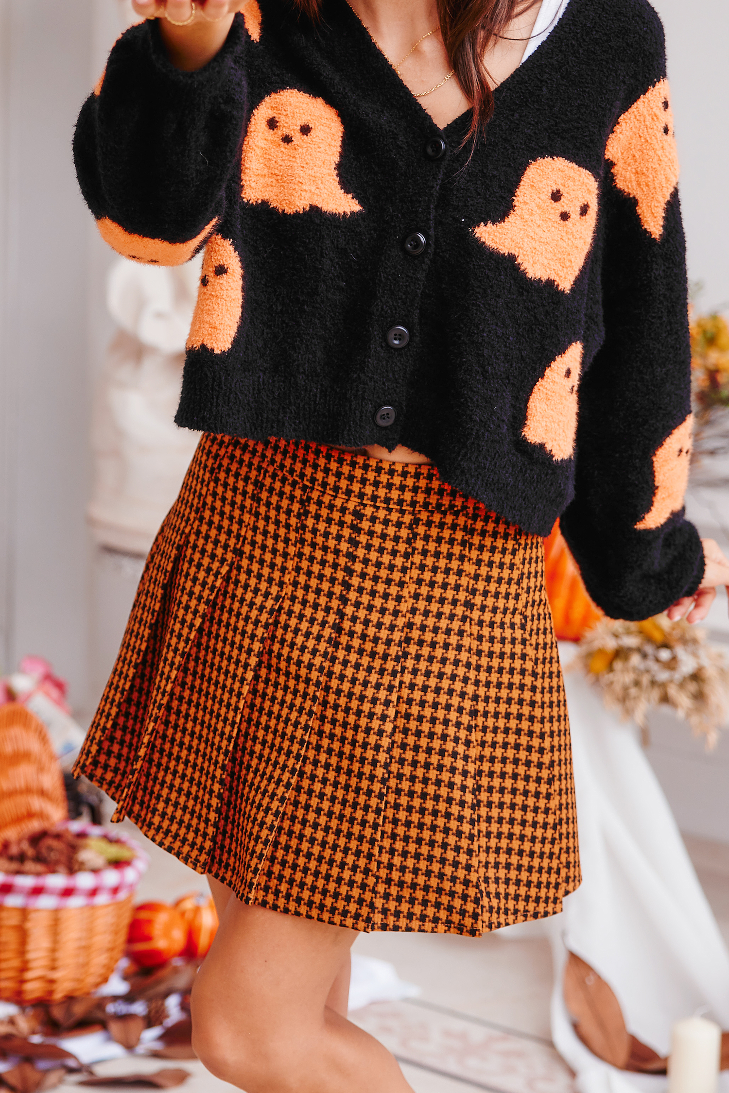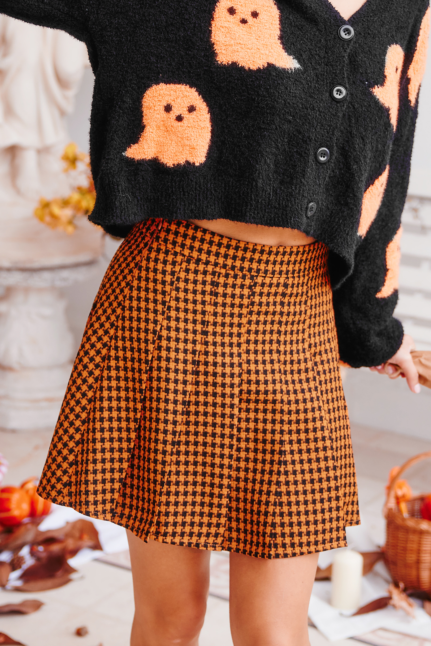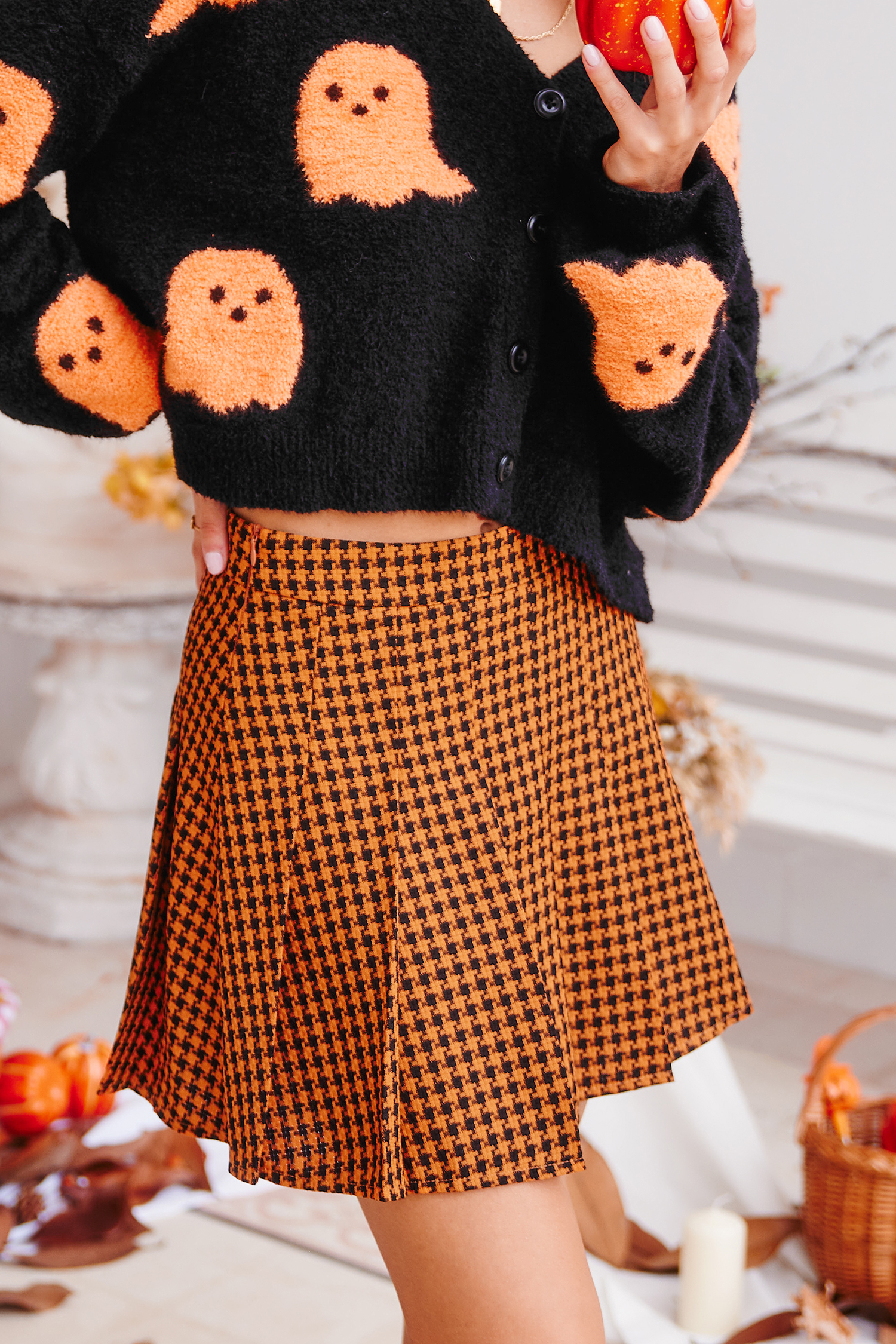 Halloween Orange & Black Houndstooth Pleated Mini Skirt