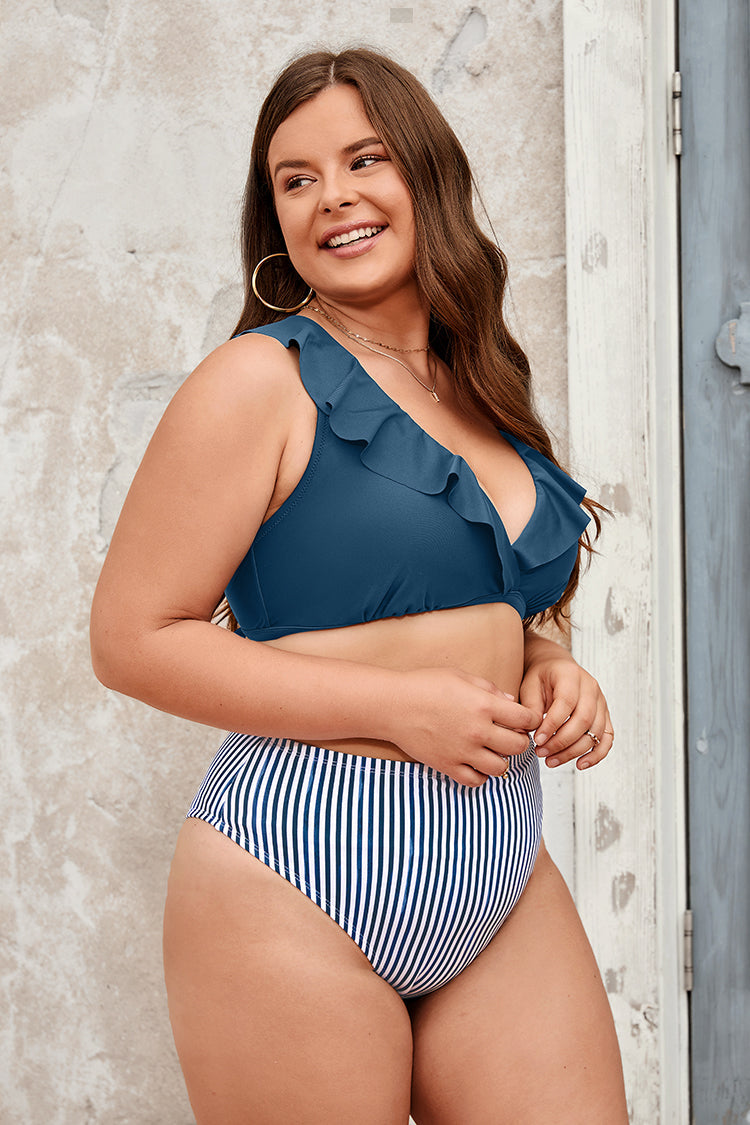 Ruffled Lace Up Bralette & Sea Shore Stripe Plus Size Bikini Set