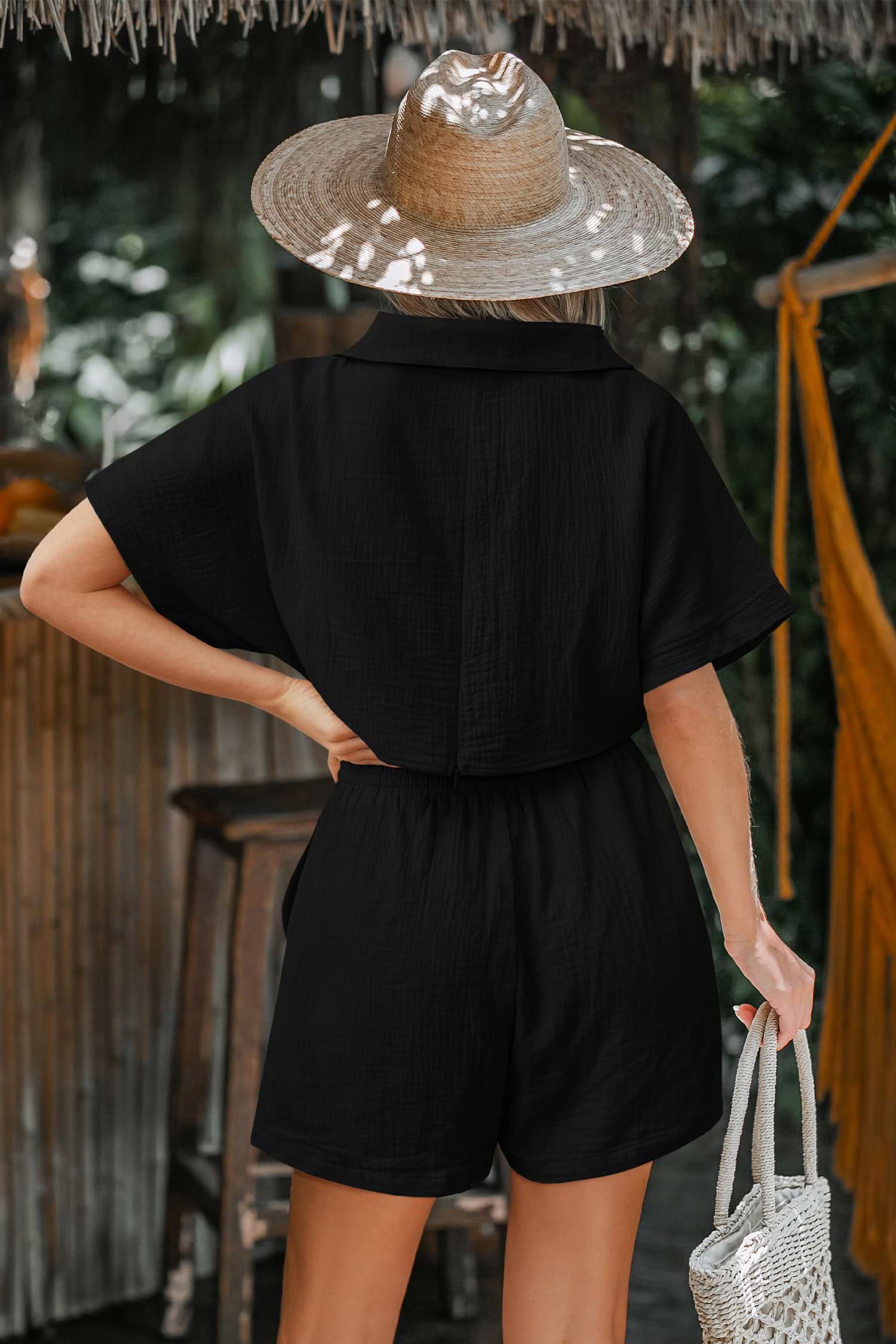 This style features a breathable design with a back zipper for easy on and off. For sizing, choose your regular size for an oversized look, or go one size down for a more fitted look. The Sassy Spin Black Romper brings playful confidence to your wardrobe! With a plunging neckline, short sleeves, and wide leg fit, it’s all about fun, flirty vibes with a polished finish.