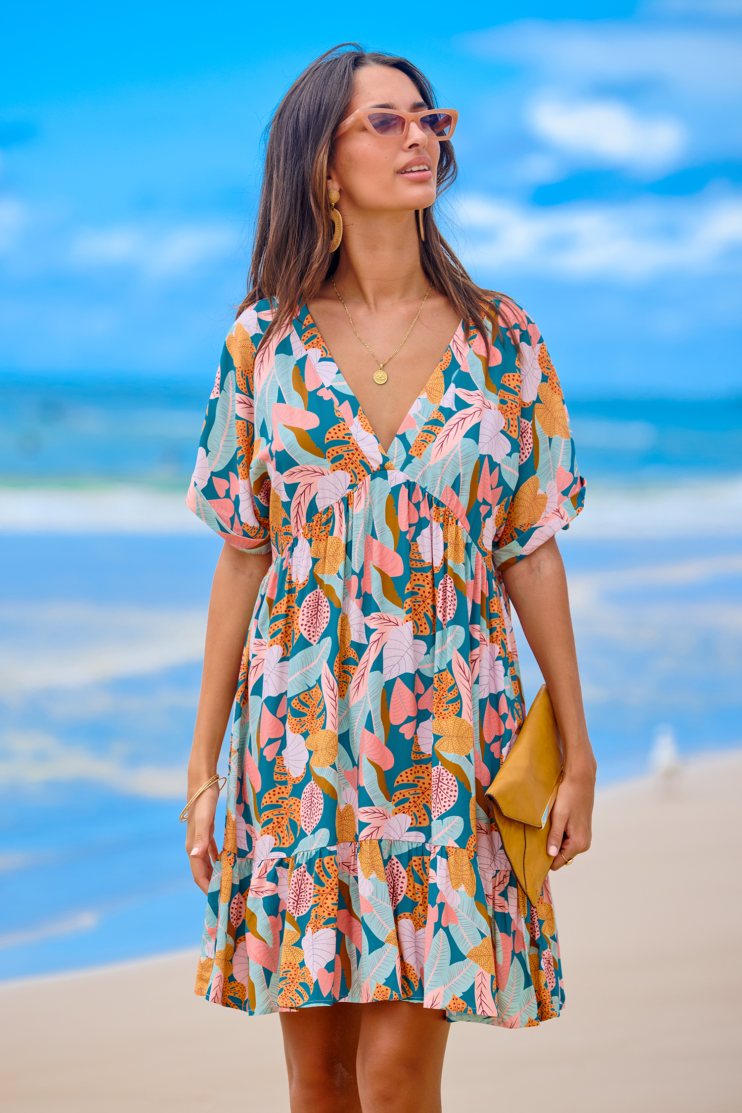 The Soft Tropics Short Sleeve Mini Dress is a serene choice for warm-weather days with its gentle hues- perfect for relaxed outings or casual gatherings.