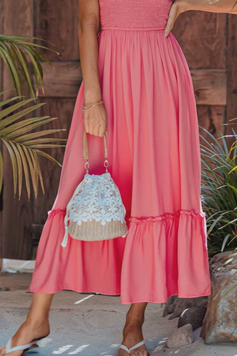 The Summer Flame Coral Maxi Dress brings vibrant energy to sunny days and warm nights! With a plunging neckline and sleeveless design, it flows effortlessly for a bold, elegant look.