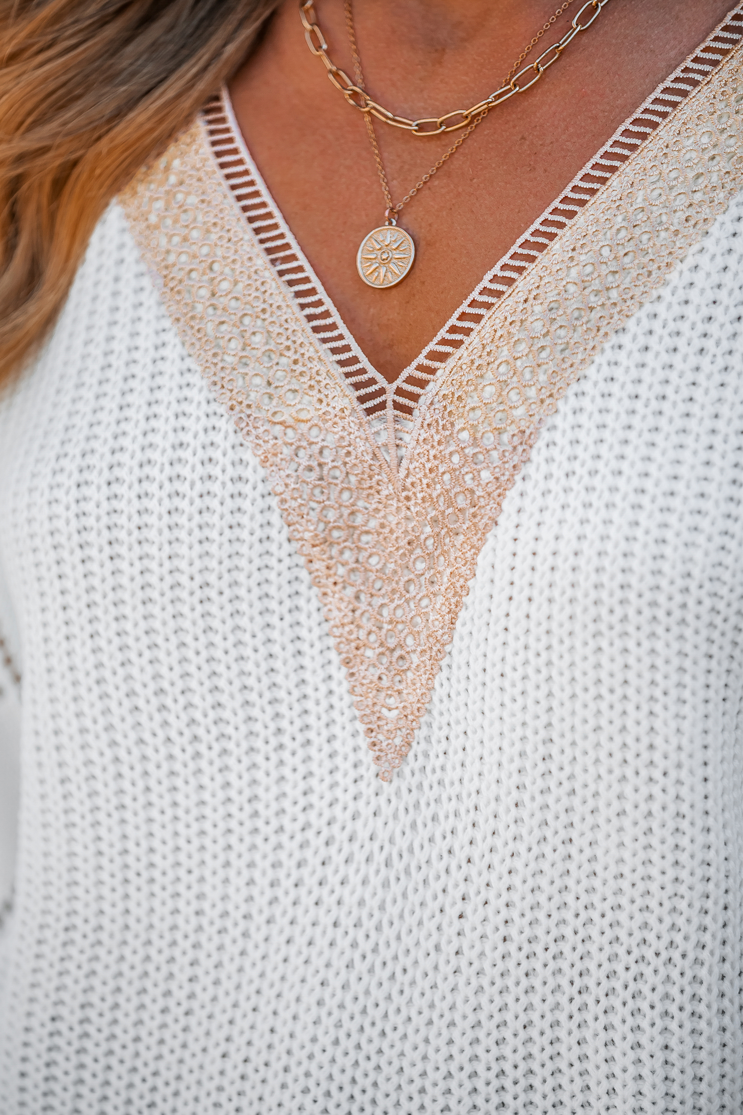 Neutral Colorblock Puff Sleeve Cable Knit Sweater