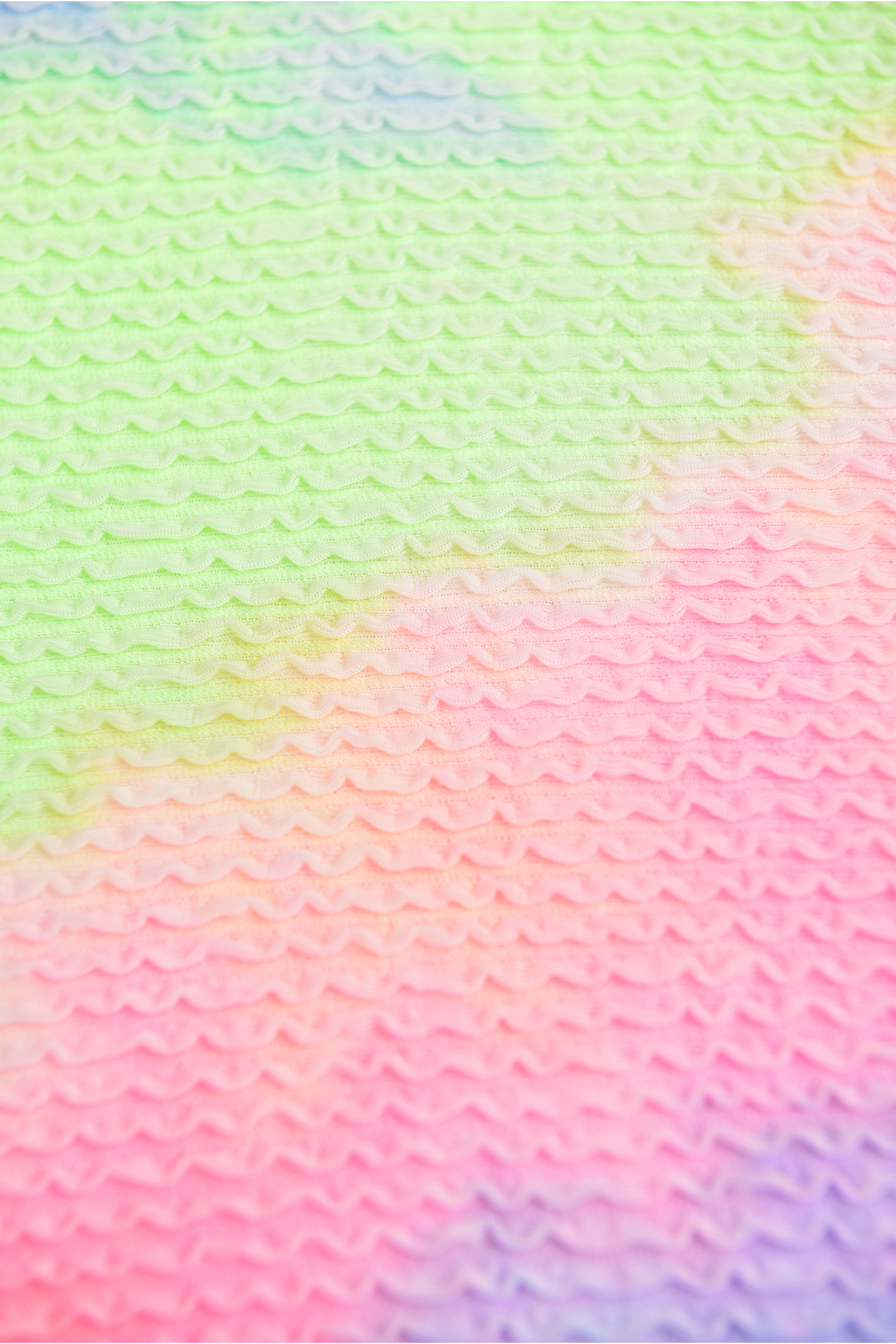 Note: This is a three-colour tie-dye, which is a special process that will result in black patches where the three colours overlap, and is irresistible.