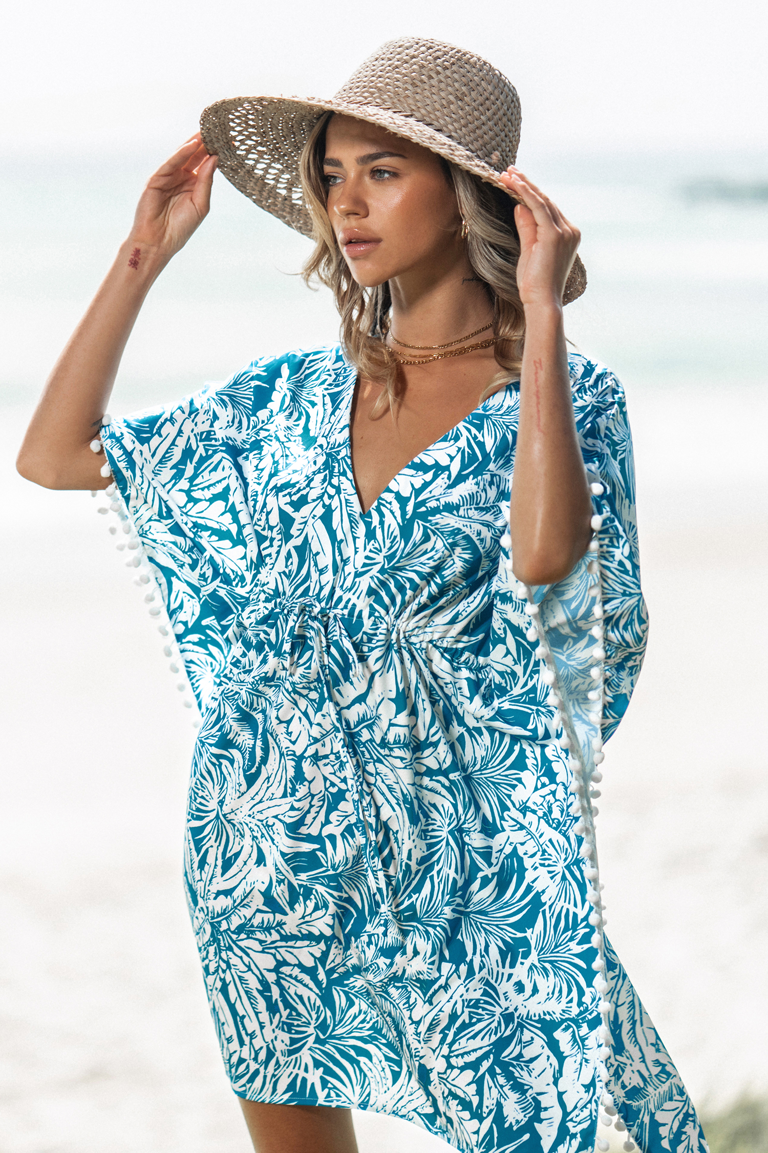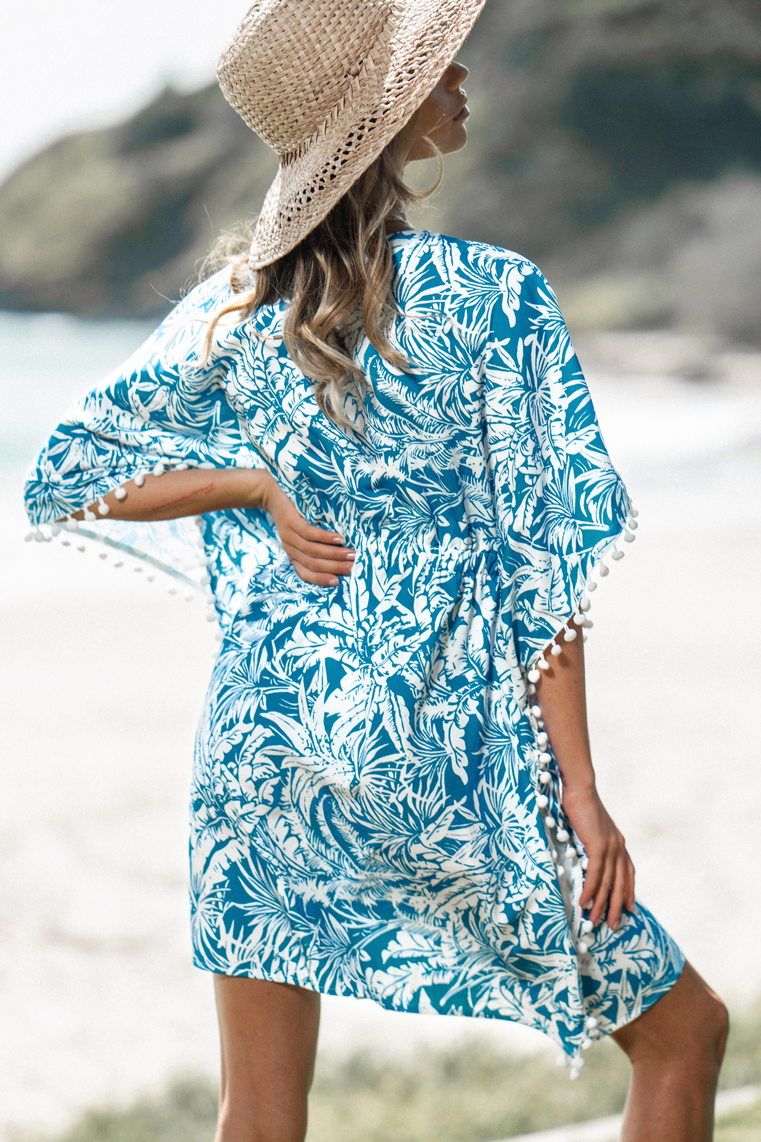 Tropical Leaf Print Pom Pom Cover-Up Dress