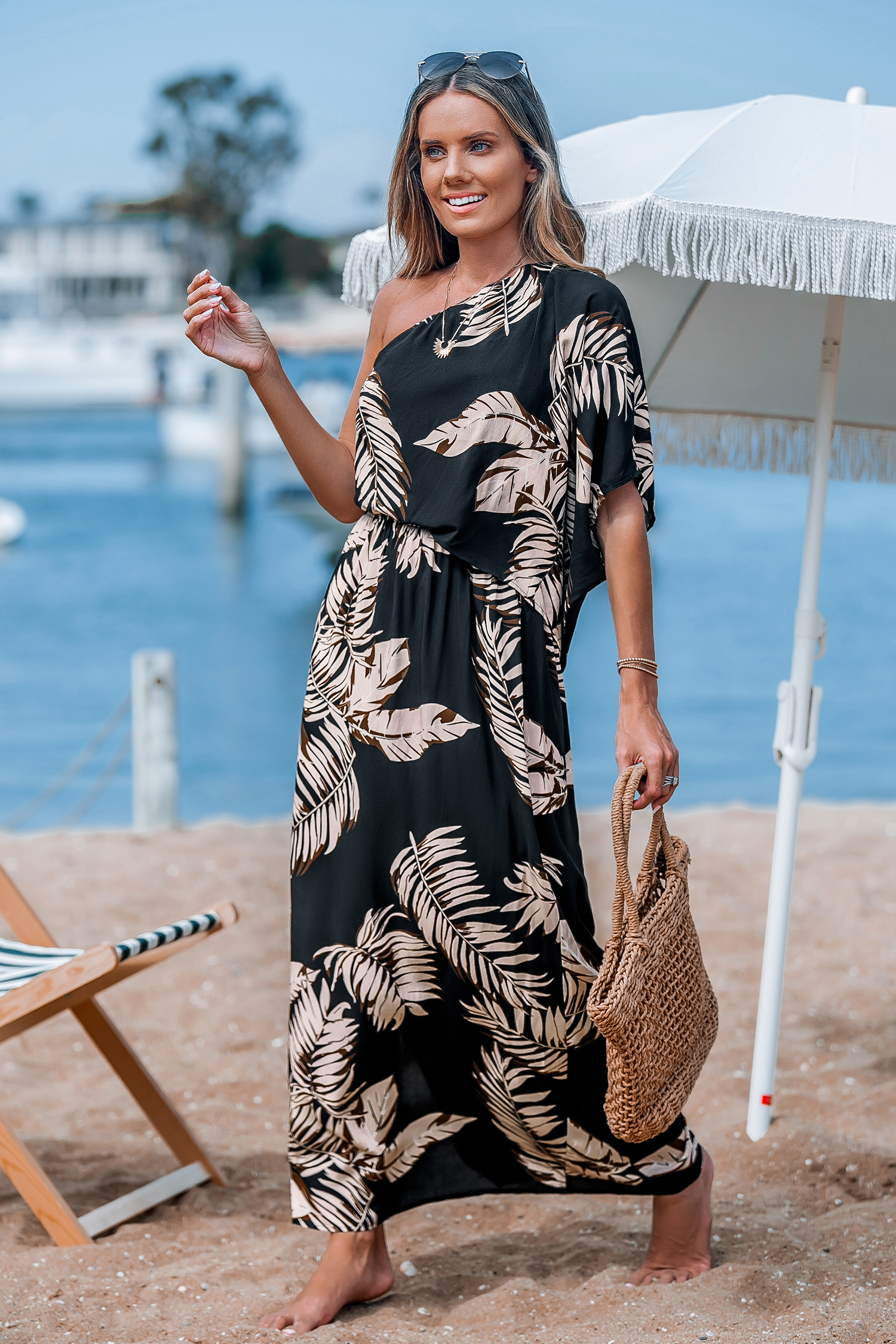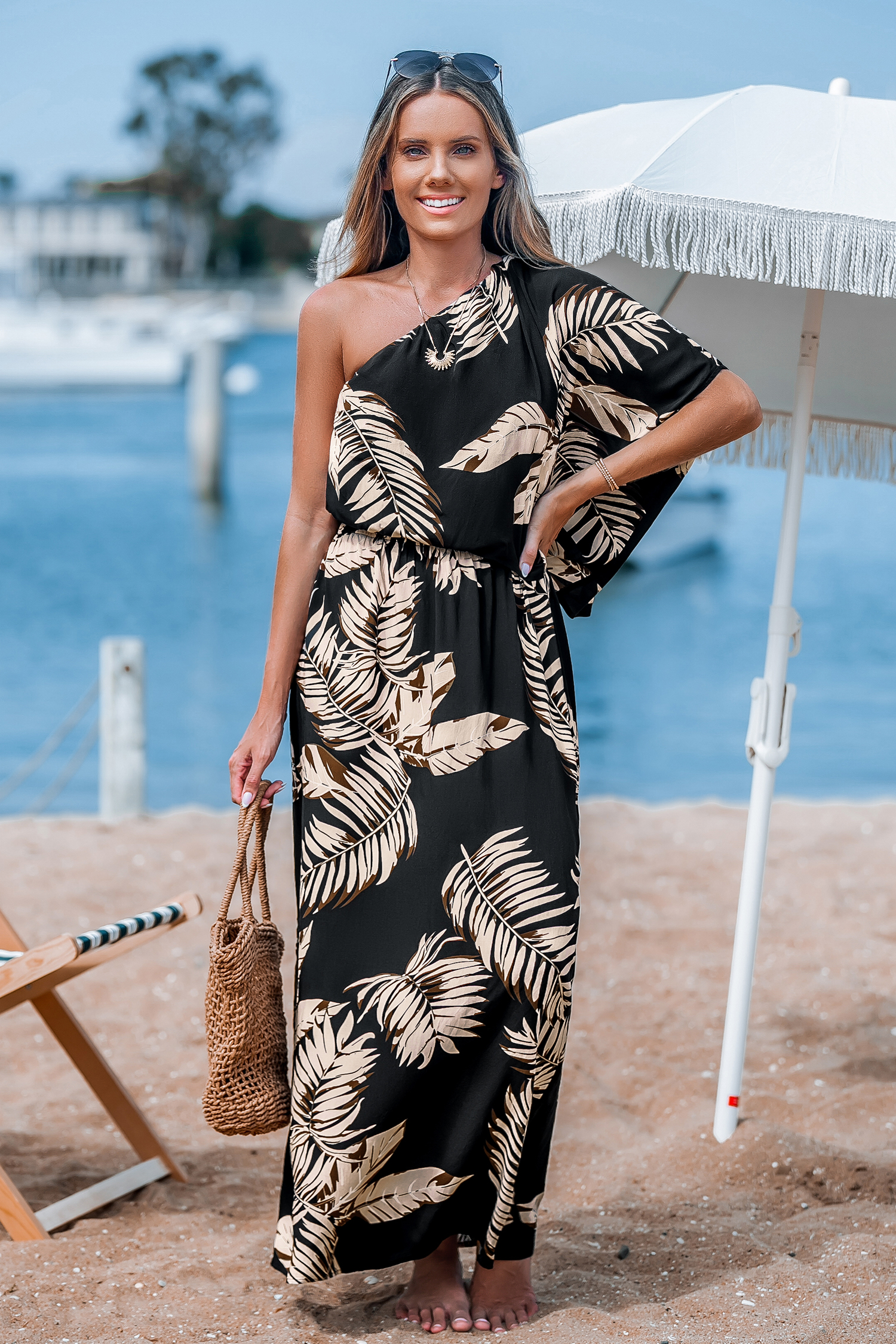 Tropical One-Shoulder Draped Bodice Maxi Dress