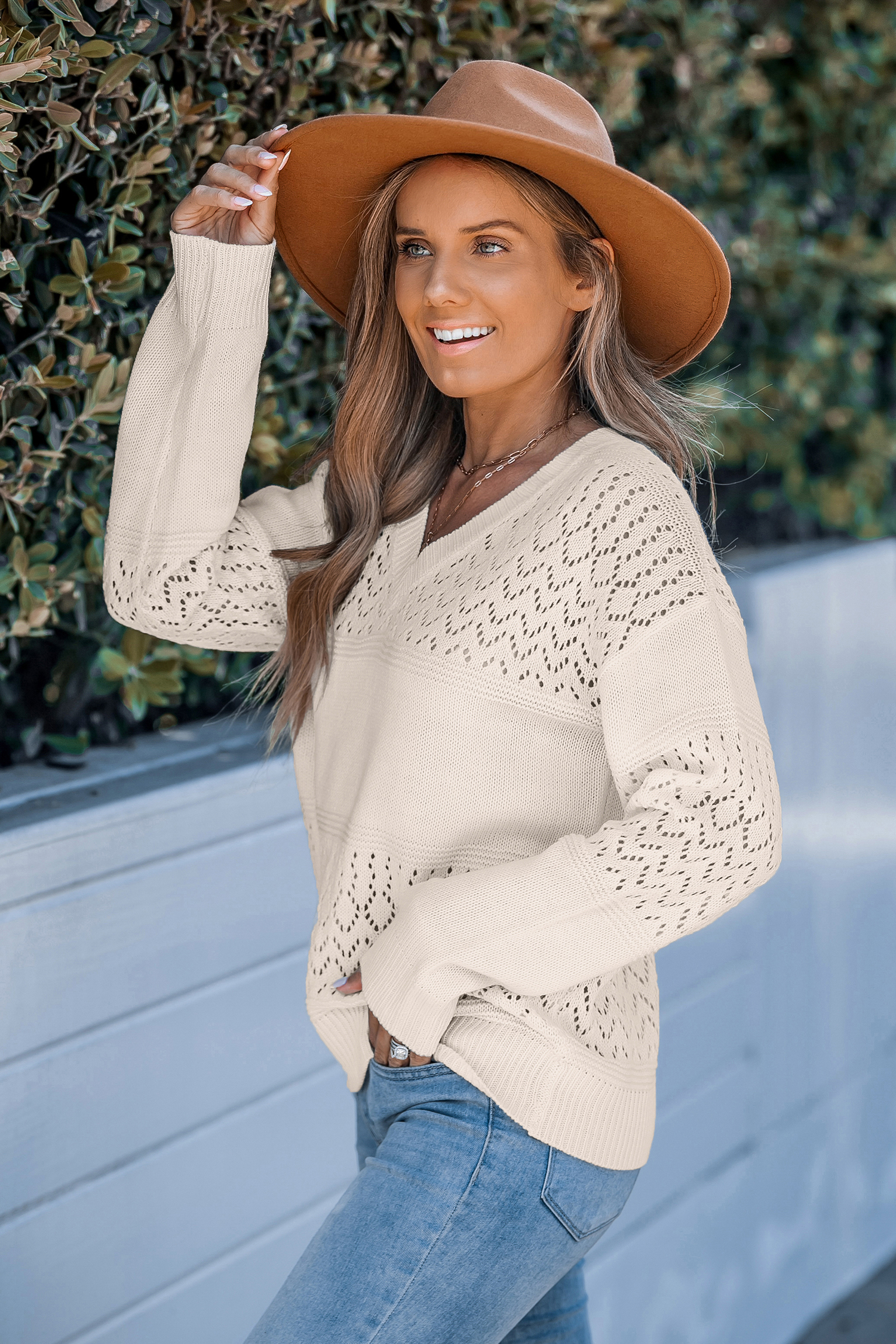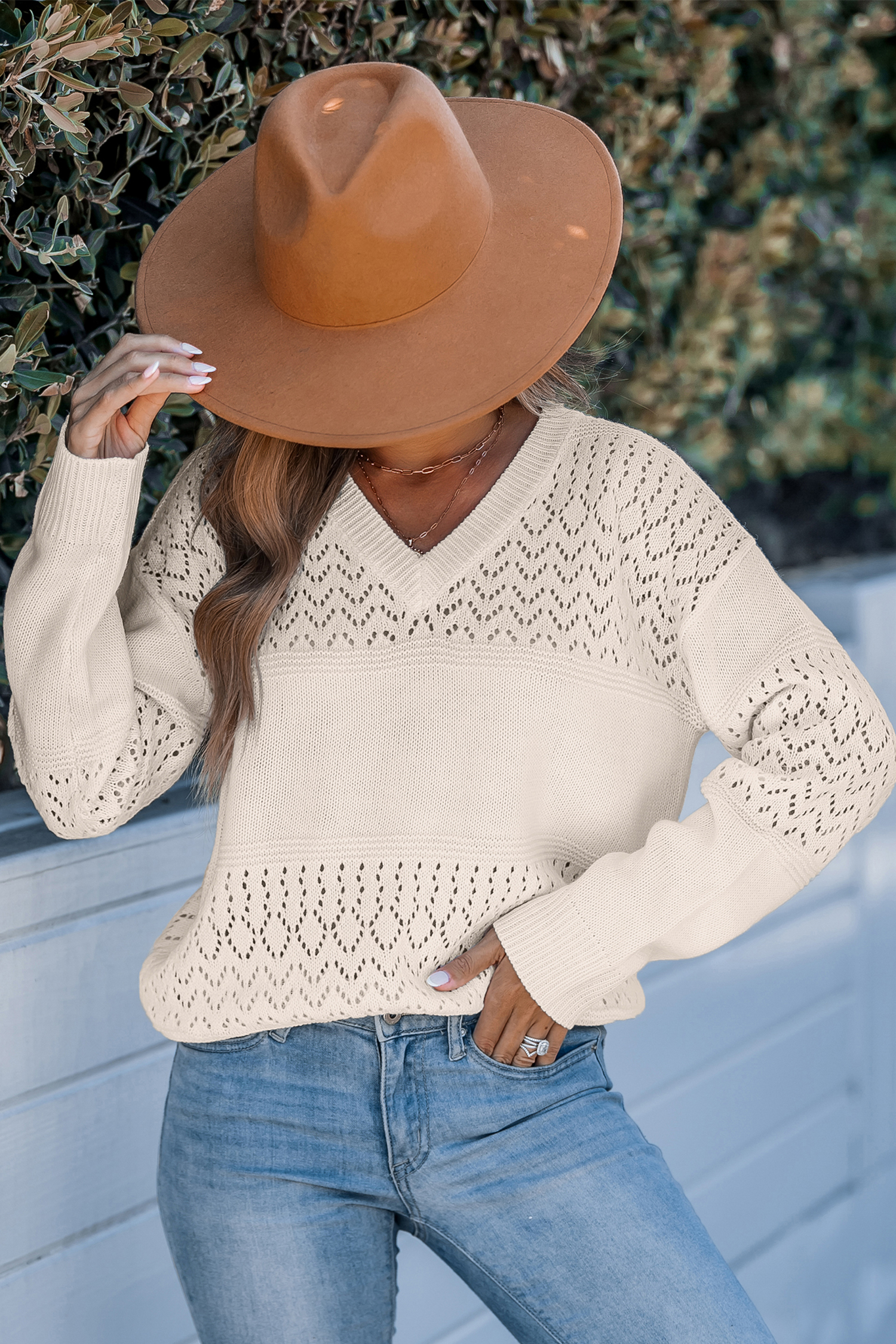 HomeV-Neck Long Sleeve Perforated Knit Sweater