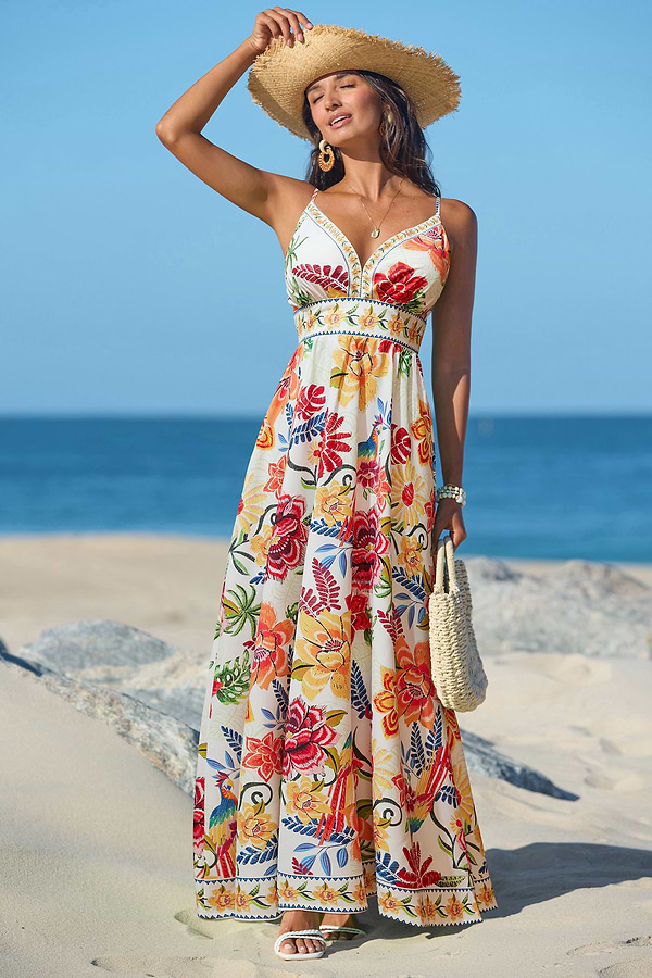 The Vibrant Oasis Tropical Maxi Dress brings a burst of color to your summer wardrobe! Featuring a plunging neckline, sleeveless design, and a back zip closure, this maxi dress promises both style and comfort for your tropical escapes.