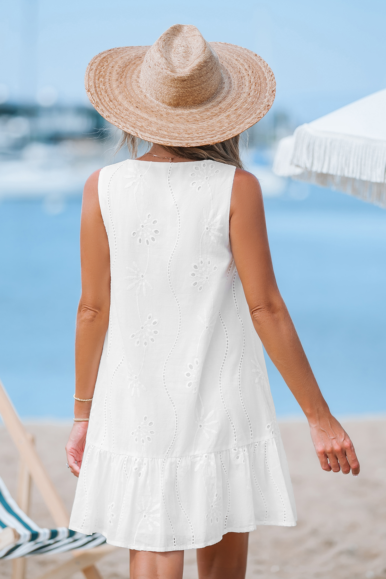 White Eyelet Linen Sleeveless Front Button Mini Dress