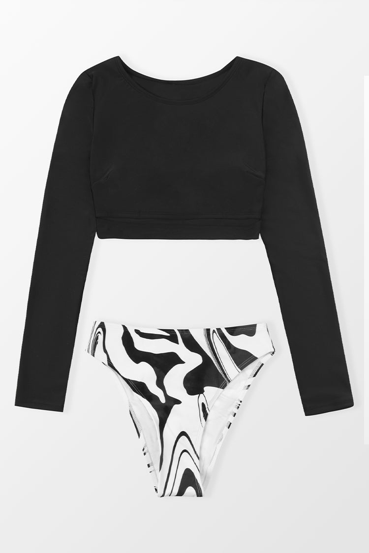 Long Sleeve Cutout Crop Black Top & Cheeky Bikini Set