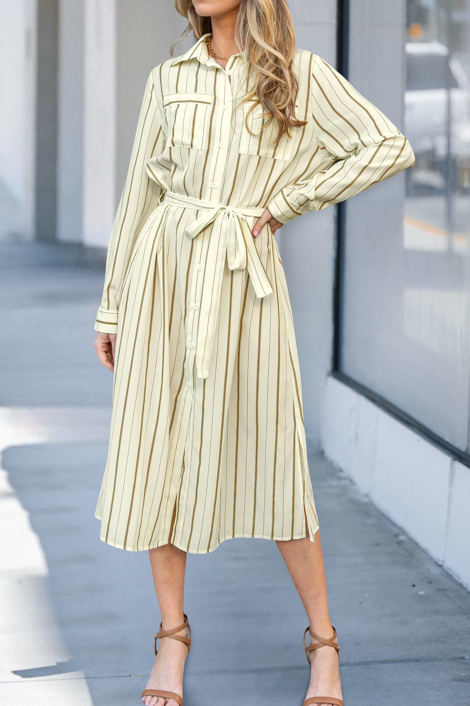 HomeYellow Striped Collared Long Sleeve Midi Dress